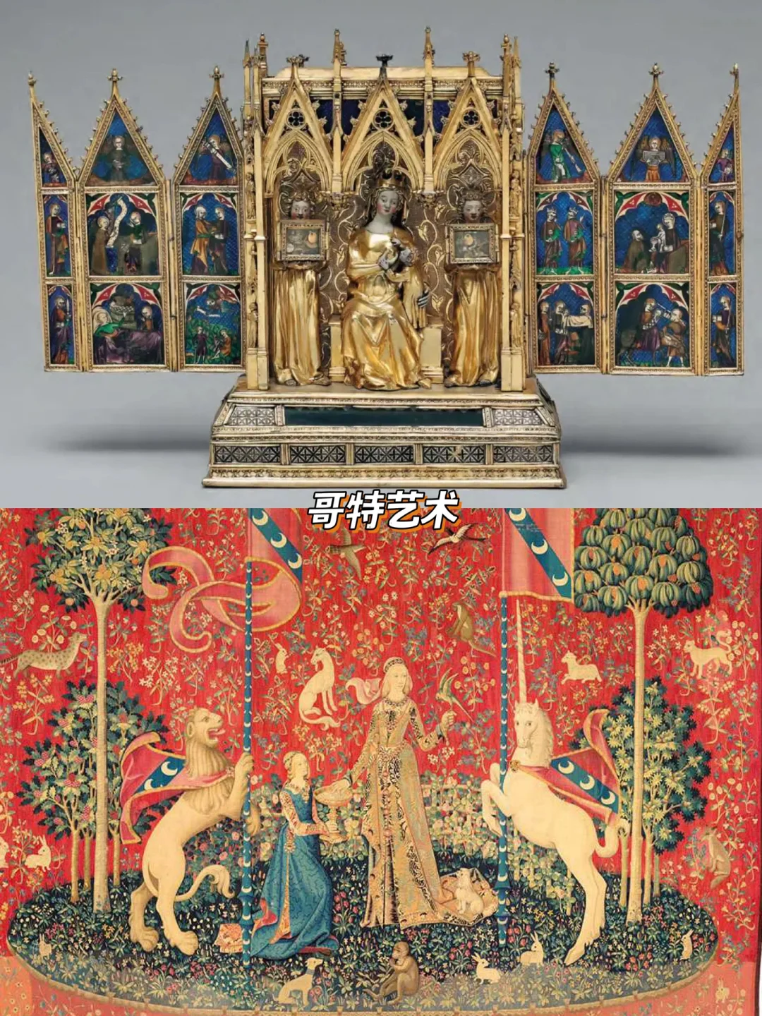 也能在圣母子的雕塑中,看到黄金与珐琅的完美契合,在“年轻女子与独角兽”的挂毯上,看到关于中世纪女子与动植物的曼妙幻想。