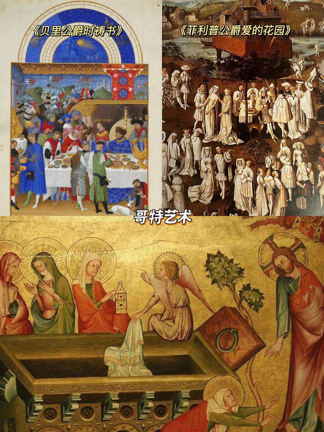 🌐而此时,除了建筑,欧洲宫廷的奢华生活还推动了哥特艺术在其他领域的发展。比如,我们能在教堂壁画上,看到金光闪闪的圣经故事;在时祷书、手抄本里,看到勃艮第公爵、贝里公爵的豪华生活