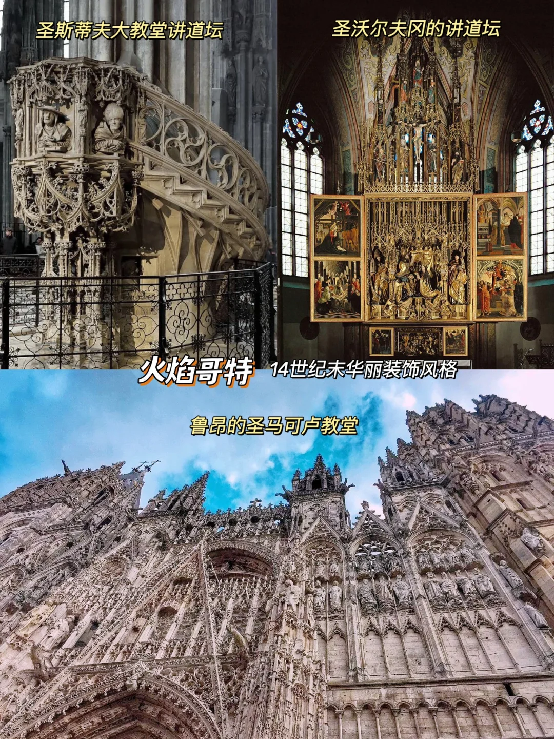 🔥14世纪末,法国诞生出火焰式哥特,这是一种哥特晚期的华丽风格,最开始以火焰式窗格为主,然后蔓延至山墙、大门、神龛、石碑等装饰物上,用高低起伏的曲线、拱形、生动的植物、人物形态,给予教堂变化莫测的想象力。