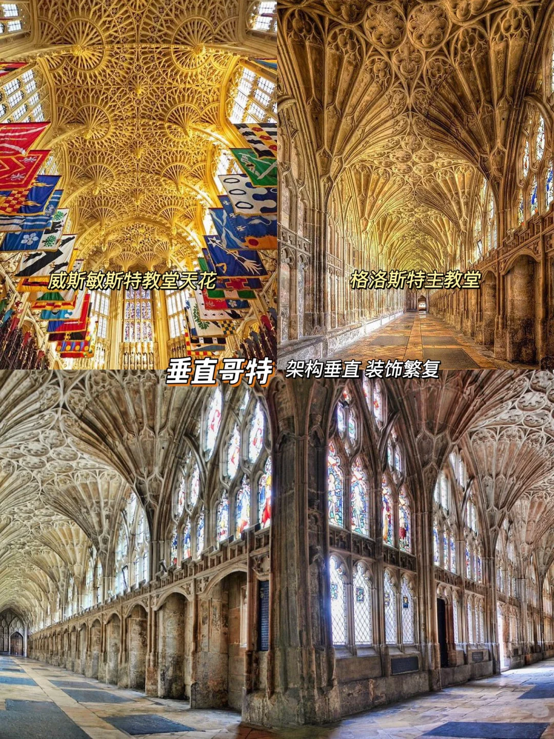 ✝️随后的14世纪,爱德华三世时代,英国哥特进入了垂直风格。这个称谓源于框架垂直,而不是视觉垂直。繁复的装饰,比如纤细的肋条、密集的小柱、遍布的花朵及四叶纹饰,附着于框架(墙体、天花板)之上,在格洛斯特主教堂的回廊里,得以充分体现。