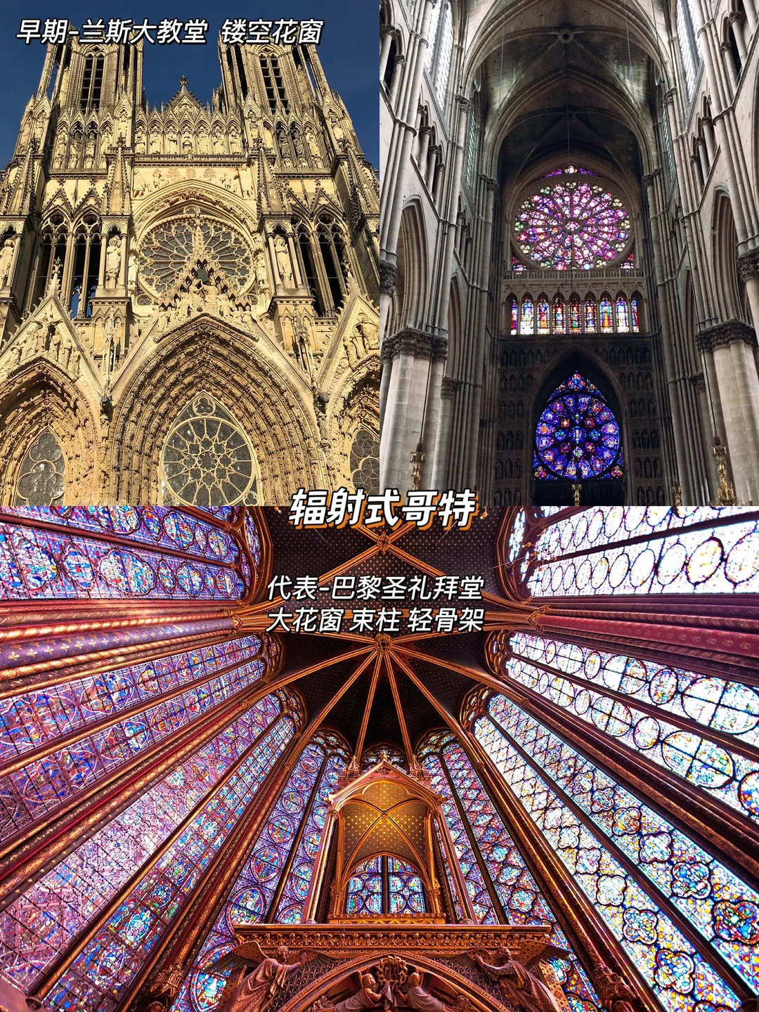 🌞随着哥特风格深度发展,一些建筑也开始细分。比如13至14世纪,在法国路易九世的统治下,放射状辐条被广泛运用在巨型玫瑰花窗和支撑立柱中,形成垂直利落、精细统一的辐射式风格,这一风格的代表建筑有兰斯大教堂和巴黎圣礼拜堂。