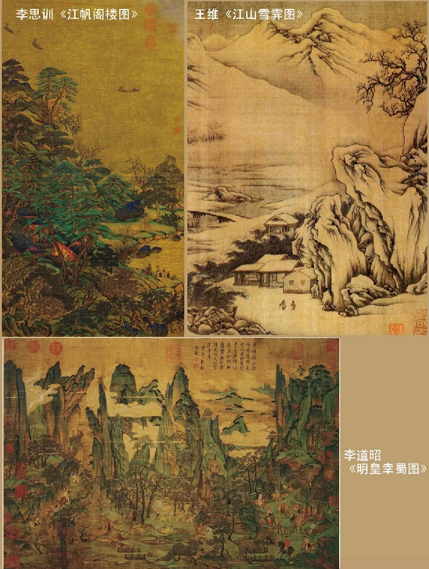-在唐代,山水画还处于早期发展阶段。受隋朝展子虔影响,李思训与其子形成更为华丽的青绿山水风格。