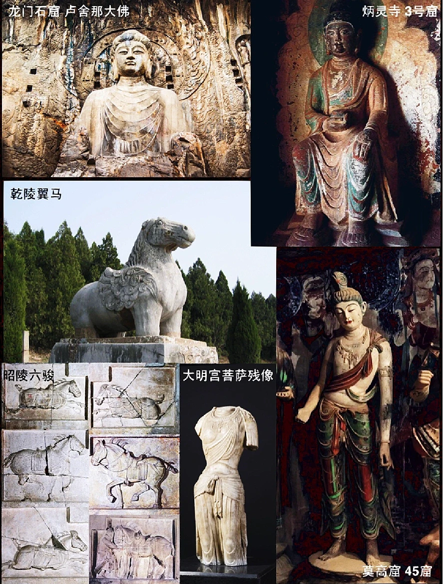 -和壁画一样,唐代雕塑常见于洞窟、寺庙和墓葬中。龙门石窟、炳灵寺中的佛像塑造,代表着唐代雕塑的最高水准。