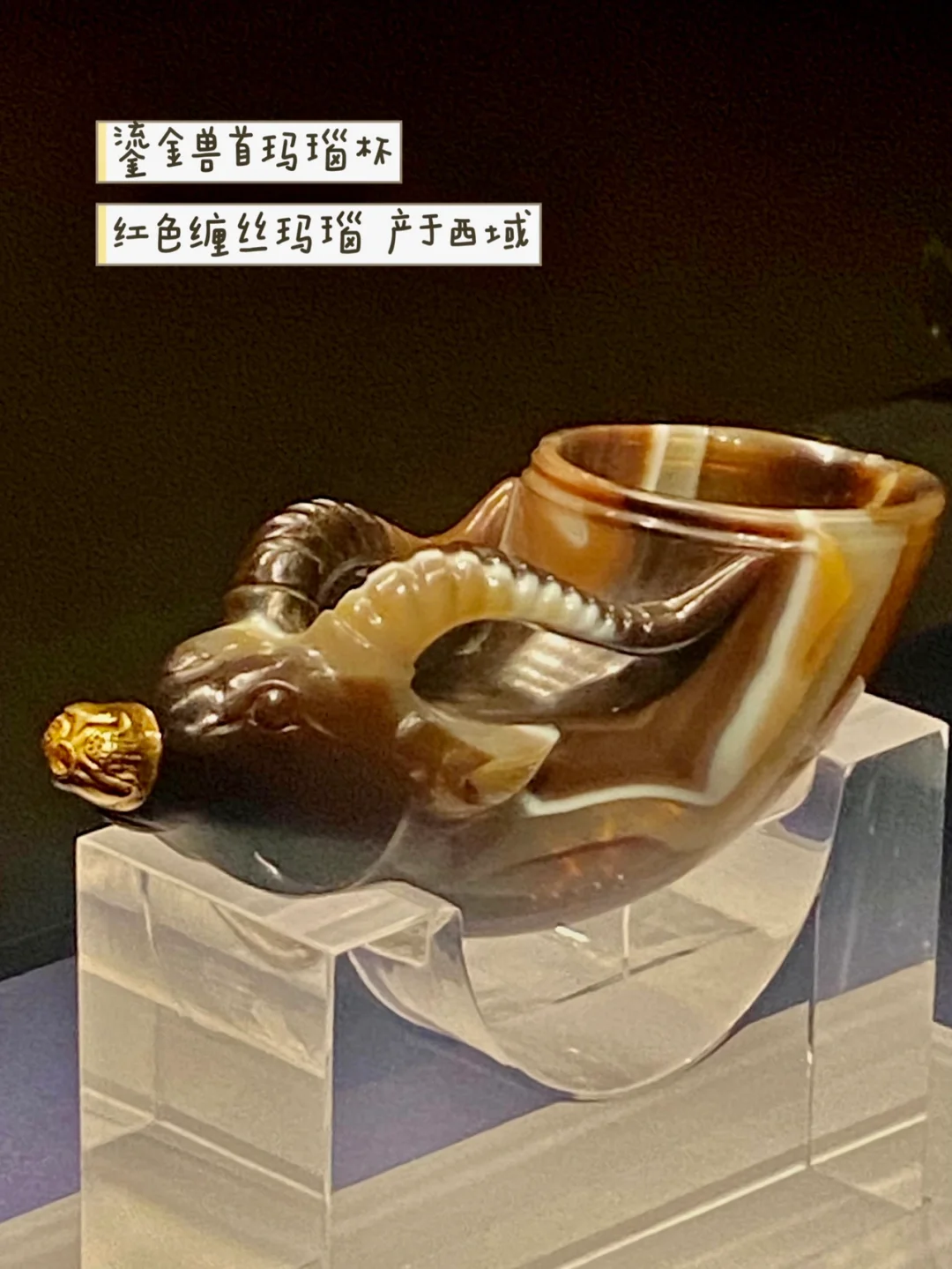 红色缠丝玛瑙,产于西域,这只玛瑙杯有很明显的西方特征。向大口倒酒,拔开镶金兽嘴,如注的酒水便会流出。