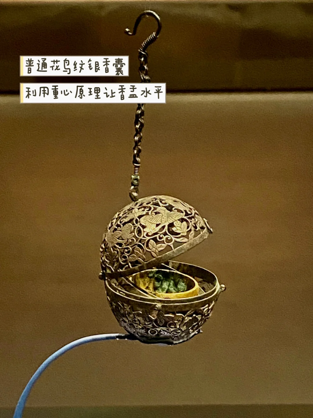 这只香囊的精妙之处,在于利用重心原理,使其无论如何摆动,香盂都保持水平。要知道,这个技术800年后,才在欧洲出现呢。