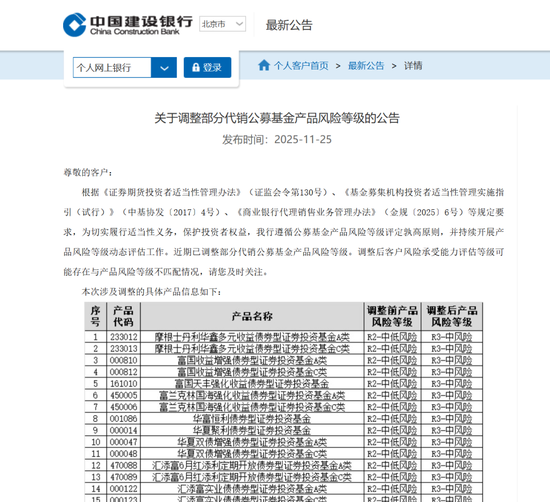 11月25日,建设银行发布公告称,为切实履行适当性义务,保护投资者权益,该行遵循公募基金产品风险等级评定孰高原则,并持续开展产品风险等级动态评估工作,近期已调整部分代销公募基金产品风险等级。