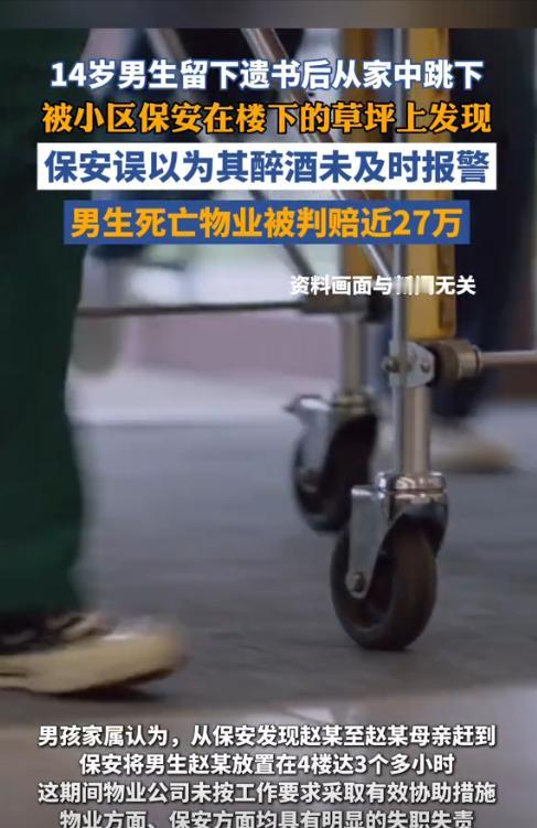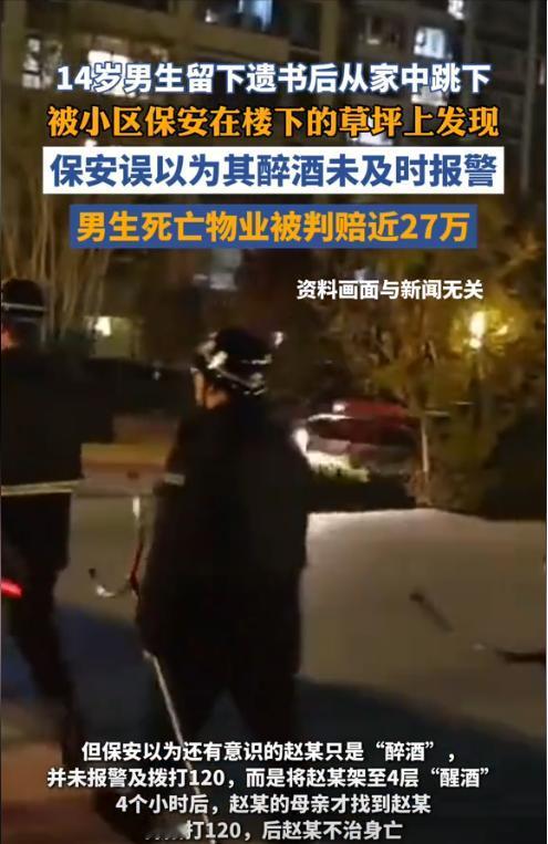 河南许昌,一14岁男生给父母留下遗书后从10楼家中跳下,摔在草坪上后没有当场死亡。有保安经过此处时,看到了男生但误认为男生是喝多了,所以询问了对方家庭住址,但保安把10楼听成了4楼,于是将其放在4楼门口后就离开了。4个小时后,母亲才找到男生,但已回天无力。事后,男生父母认为是保安的错误判断耽误了最佳救治时机,于是将物业公司告上法院,索赔近90多万元。 (来源:海报新闻) 14岁的小赵,生命最后的那个深秋傍晚,本可以还像往常一样做作业、吃晚饭,可一场关于学业的争吵,把他推向了十楼的窗边。 那一跳,让家里瞬间陷入绝望,但更让人心痛的,是他坠楼后那几个关键小时里,本能救他的机会,被一连串离谱的误判给彻底浪费了。 事情从去年11月傍晚说起,小区里两个保安例行巡逻,手电筒一扫,草坪上躺着一个孩子,动不了、说话含糊。 按常理,这至少也算个需要急救的情况,可两名保安第一反应竟是:“这孩子是不是喝醉了?” 一个十几岁的学生,瘫在地上、站不起来、意识混乱,被当成醉汉,这第一步就走偏了。 他们简单问了几句,小赵勉强挤出“5号楼、2单元”几个字,但当再问具体楼层,他虚弱地说“1001”,却被误听成“401”,一句话听错,把孩子的生门听没了。 接下来发生的事,更像是一场荒唐的误操作,保安二话不说便把孩子架起来,拖进电梯,既没报警、也没打120,甚至连再确认一句“你到底住哪层?”都没有。 到了所谓的“401”,他们也没敲门、没确认,就把人往地上一放,当成处理完一个醉酒的住户一样拍拍手走了,继续他们的巡逻。 这期间,小赵的父母早已快疯了,争吵后发现了遗书,两个人几乎是哭着冲下楼,翻遍草丛、停车场、电梯口,喊着孩子的名字满小区乱跑。 谁也想不到,他们无数次经过的那部电梯,里面曾载着他们的孩子,却被送错了楼层,孤零零地躺在别人家门口。 直到晚上九点多,他们才选择最笨的办法——一层层往上找,推开401那条走廊的拐角时,孩子靠在地上,脸色惨白、嘴唇发紫,几乎没了动静,距离被发现,已经过去整整三个多小时。 救护车来的很快,但医护再快,也追不上那消逝的三个小时,深夜里,医院宣读了死亡消息,所有的希望,都停在那个“听错的门牌号”和“没打的一通电话”里。 事后,小赵父母将物业告上法庭,认为保安失职是导致孩子错过最佳抢救时机的重要原因。 “听错楼层”“不报警”“不急救”这些操作,怎么也说不过去,物业则坚称:孩子自己说不需要帮忙,他们不便强行处理,并且孩子跳楼本身就是自杀,不能怪他们。 法院却看得更清楚,孩子自杀有其自身原因,家长监护也存在疏忽,这部分责任不能推。 但物业作为服务方,在面对一个明显无法判断状况、又处于危险中的未成年人时,本应有起码的职业判断和急救意识,把人随便放在走廊就离开,显然没有尽到“合理注意义务”。 更关键的是,小赵父母拒绝做遗体解剖,无法明确到底是坠落当场致命,还是延误救治导致死亡,因此责任链条不完整,但物业方的疏忽仍然成立。 于是,一审判物业承担30%的责任,二审维持原判,算下来,加上精神抚慰金,物业需赔偿共26万多元。