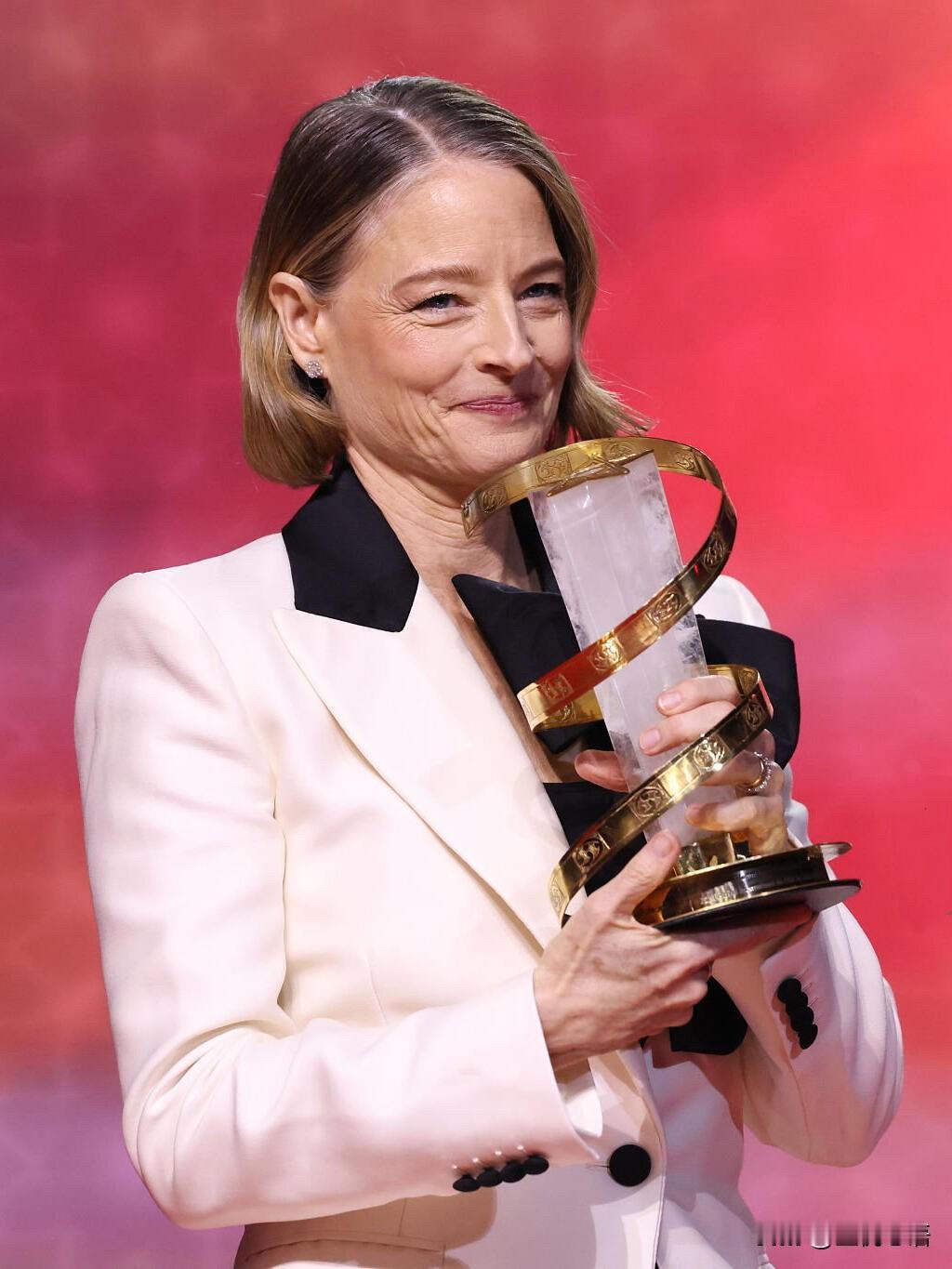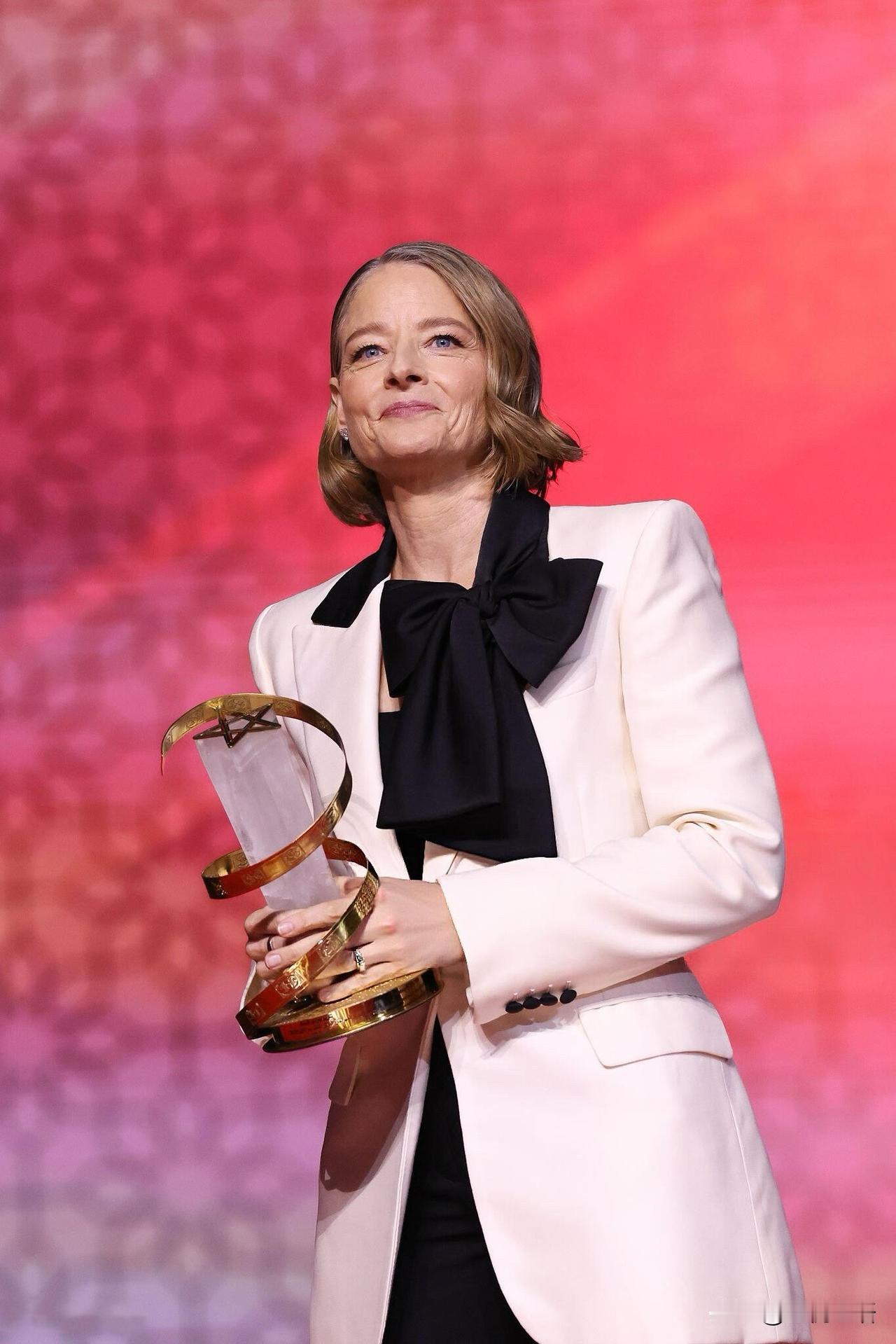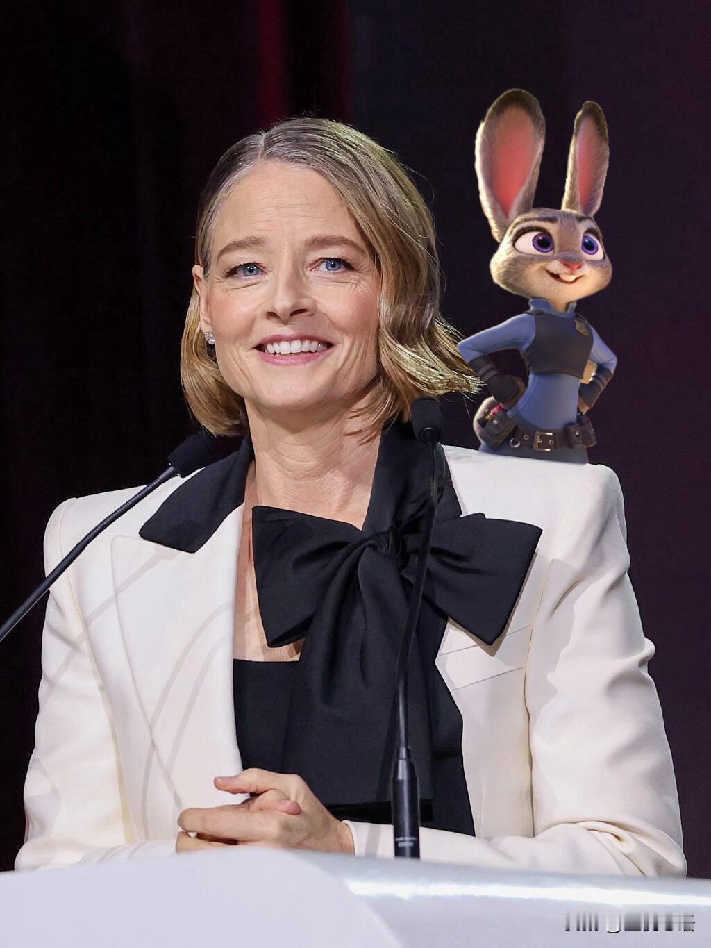 谁懂啊!朱迪·福斯特才是现实版“女王”😭 63岁的朱迪昨晚在马拉喀什电影节拿了终身成就奖!这哪是领奖,这是传奇本人发光好吗✨ 谁能想到《疯狂动物城》里的朱迪兔, 原型居然是她! 动画里藏着超多《沉默的羔羊》的致敬细节, 原来可爱兔子的内核, 是横扫奥斯卡的女王级演员👏 3岁演戏,边拍戏边考耶鲁, 30岁前就抱回两座奥斯卡影后奖杯, 既是演员,也是导演、制片人, 在好莱坞硬生生拼出了女性的话语权! 最戳我的是她的生活态度, 不晒社交平台,不搞流量套路, 低调结婚,把日子过成自己的主场, 领奖时说“最大成就是拥有真正的幸福”, 这才是女性最酷的活法啊❤️ 不靠年龄定义,不靠外界评价, 专注热爱,坚守自我, 这样的朱迪·福斯特, 才是值得我们追一辈子的偶像!