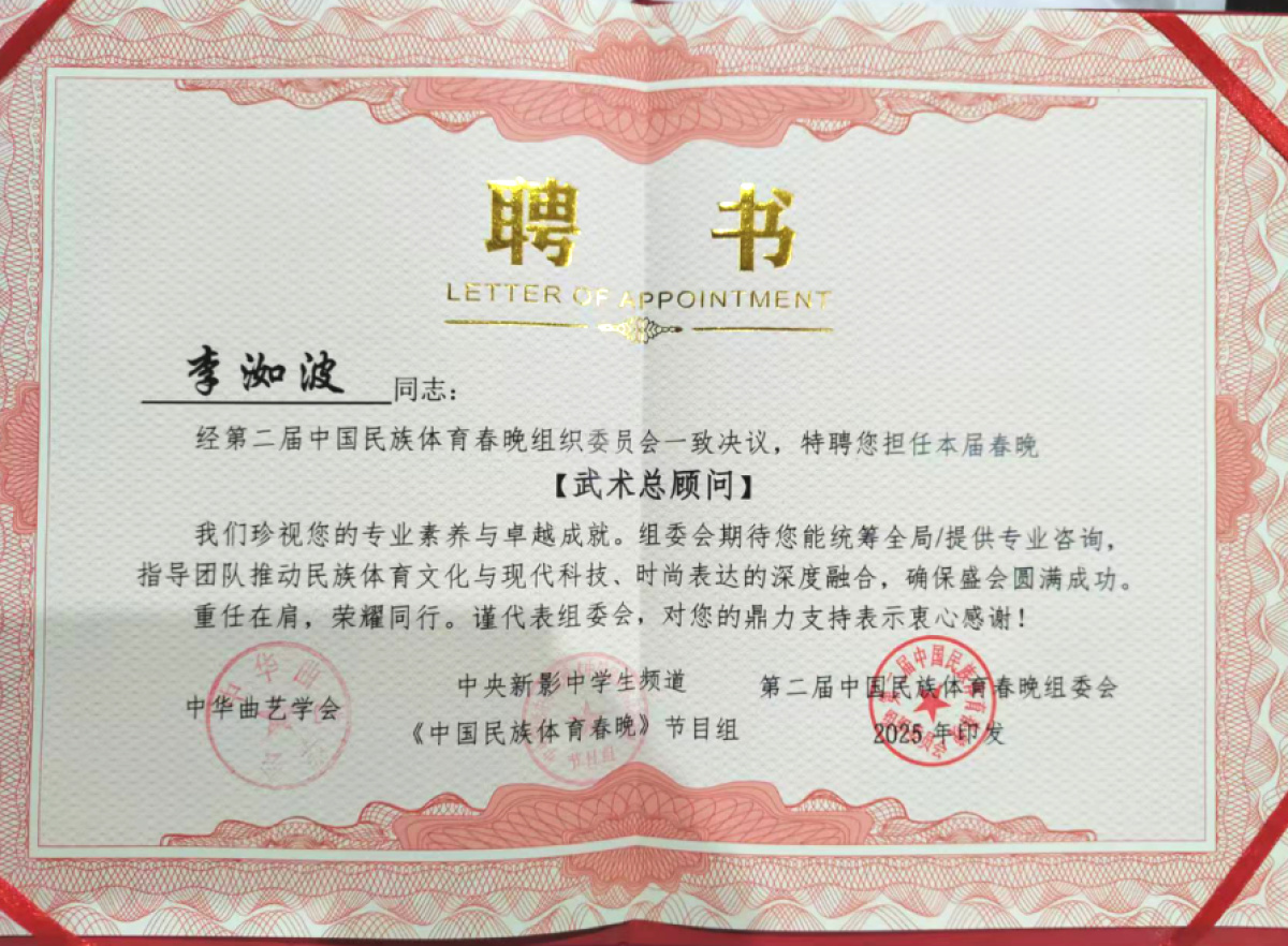 据介绍,在当天的第二届中国民族体育春晚新闻发布会上,组委会主席项玉章主持了聘书颁发仪式,李洳波作为国家级非遗传承人,凭借其在传统武术领域的深厚造诣和传承贡献,获聘武术总顾问。在具体履职过程中,李洳波将为晚会提供武术指导和专业咨询,还将负责审查晚会涉及的武术内容,确保所有展示的民族体育项目和民俗活动都得到真实、准确的呈现。
