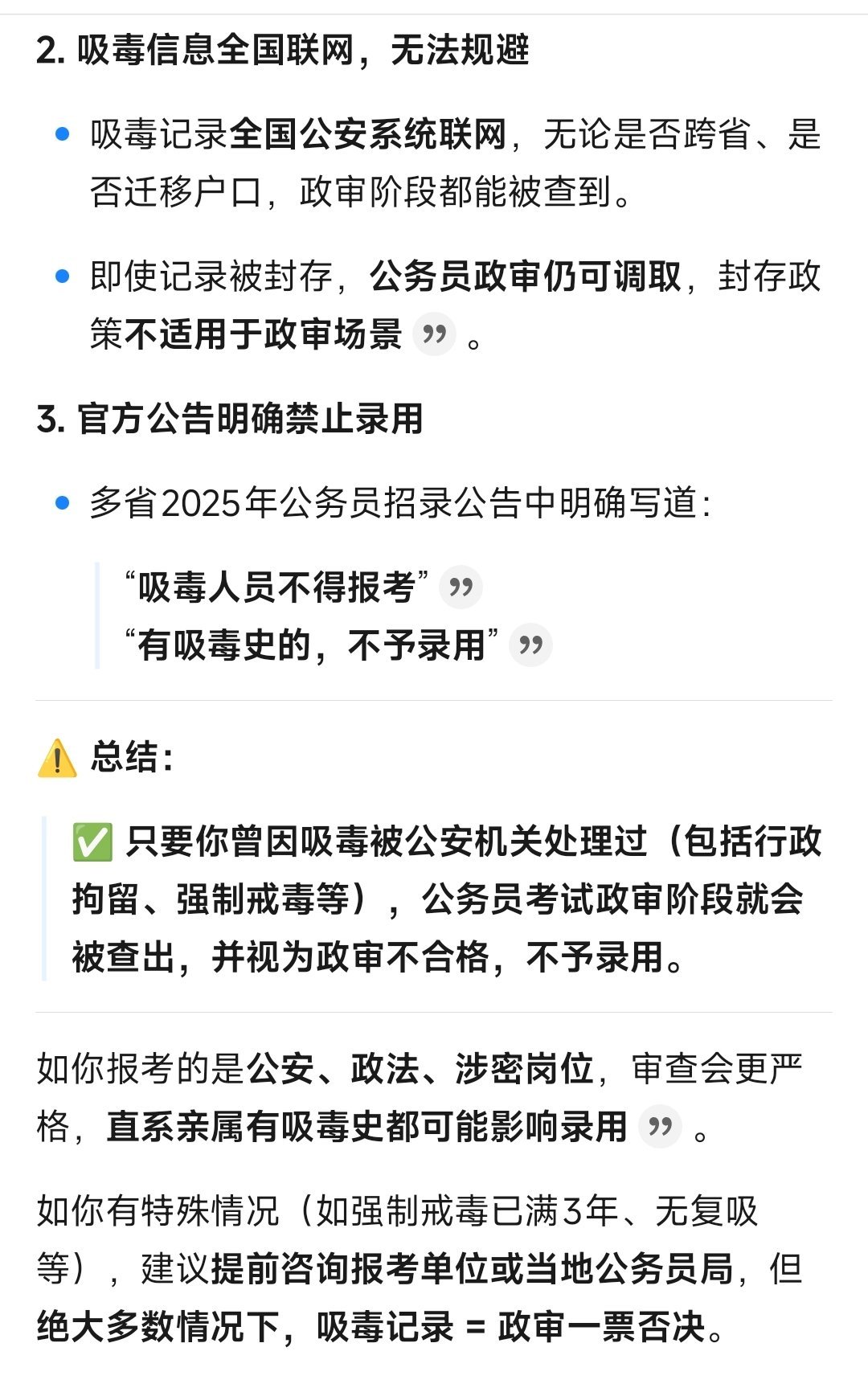 目前的公务员考试,吸毒属于一票否决事项。就算封存了也没用,政审时会调取“无犯罪记录证明”,其中包含吸毒的行政处罚记录。赵宏教授不仅在推动封存记录,她想推动的是清除记录。假如真让她打着“进步”“人权”的旗号成功实现这个目标,吸毒者就可以正大光明考公。甚至按照她的滑坡逻辑延伸一下:她真正的目的其实是吸毒者考公进体制。