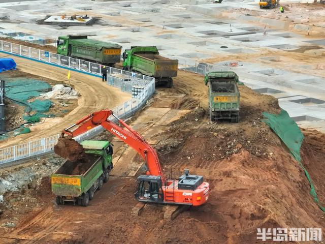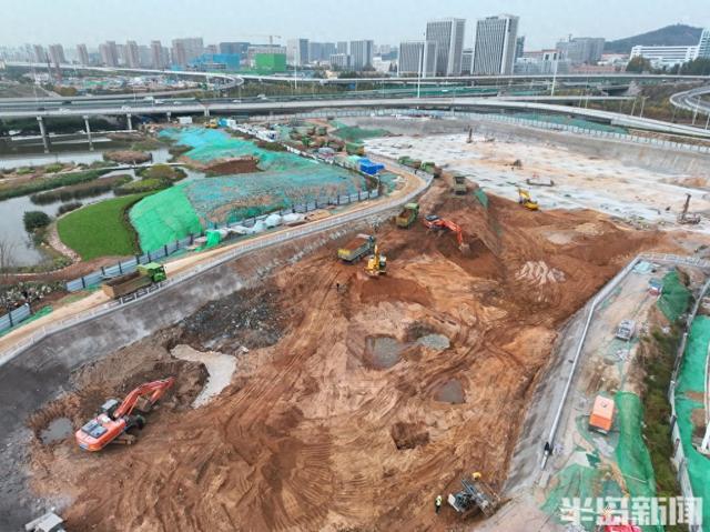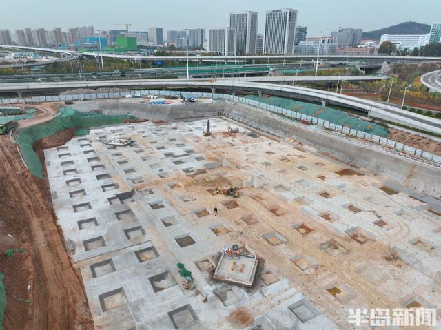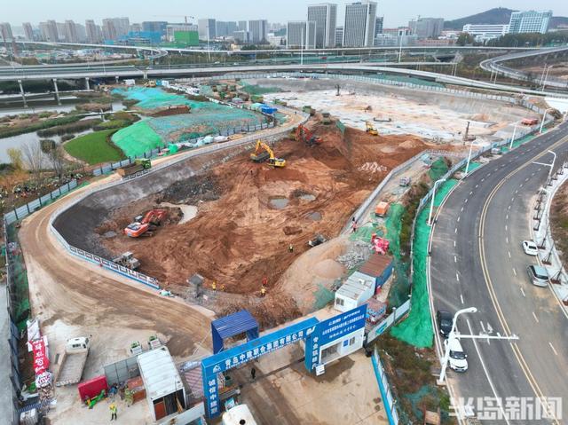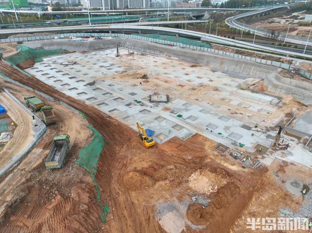 12月1日,在崂山区张村河以北,青银高速以东,长沙路以南区域,这里正在建设一处大型地下停车场,施工车辆和人员正在忙碌施工当中。