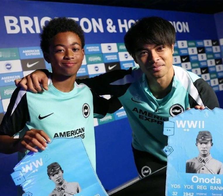 英超球星举着战犯照片笑,这事真不能随便翻篇!看到三笘薰和小球员拿着小野田宽郎卡片