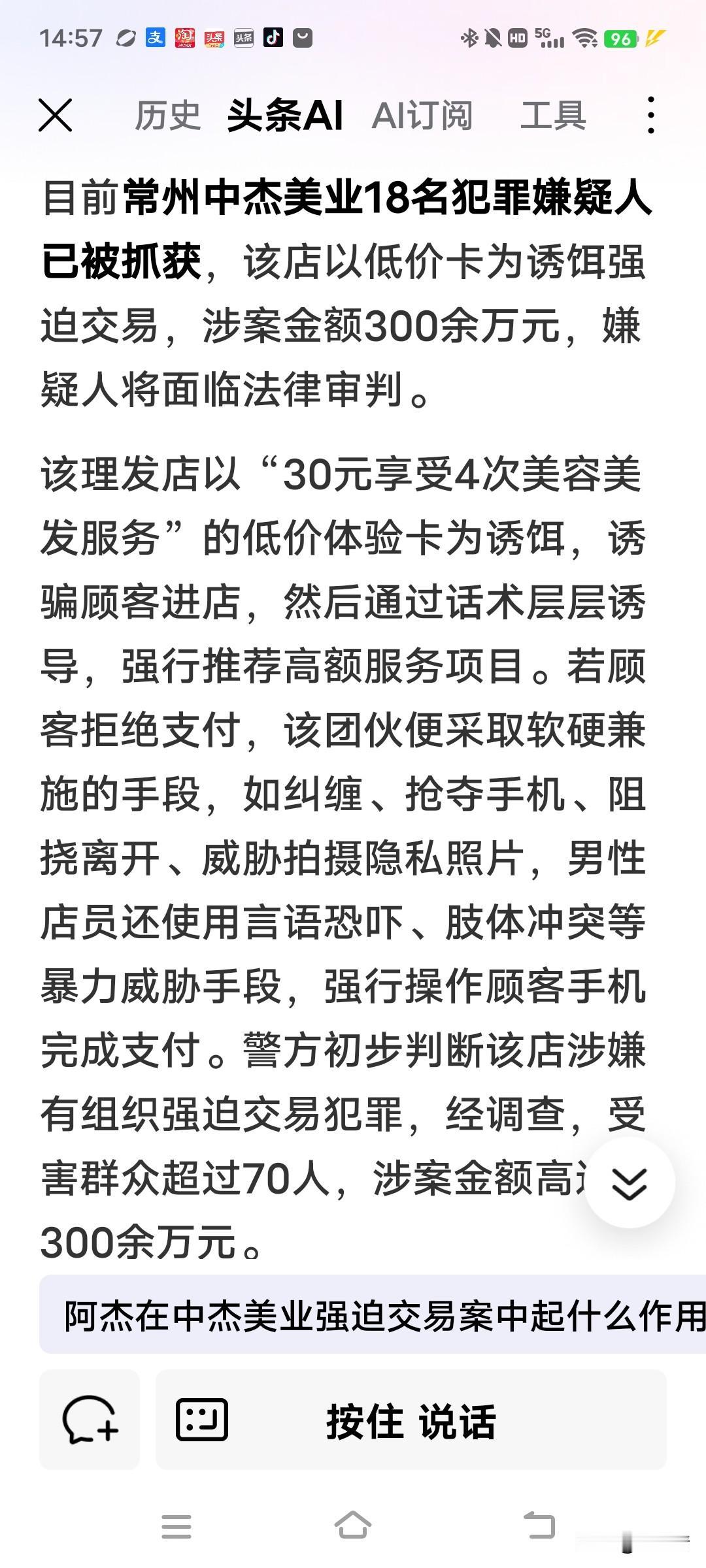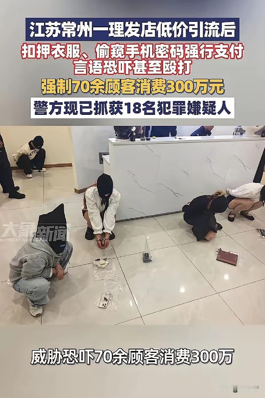 贪便宜上当。常州一理发店以低价办卡引流,到店后变着法强制消费,涉案金额300多万,该店18名涉案人员被抓。切记,便宜与当紧挨着。 该店专走歪门邪道,线上线下推广30元美容美发4次,划下来一次几块钱,明眼人一看就是骗人的。 偏偏有那些图便宜的人,赶紧充值30块钱办卡,却不知当正在等着他们。进店后,这帮人用话术哄骗,强行推荐高价服务项目,有人看出门道,怕上当想遛。 他们软硬兼施,抢夺手机,威胁拍摄隐私照片,恐吓客人,甚至强迫支付高额费用。来办卡图便宜的,眼看吃哑巴亏。 虽然,这些不走正道的人被抓了,但也给自己带来麻烦。给消费者提个醒,遇到远低市场价的任何促销活动,要多问几个为什么?切记,便宜和当紧挨着!理发店价格陷阱 理发消费套路 办卡套路 理发店遭天价 常州美容院诈骗