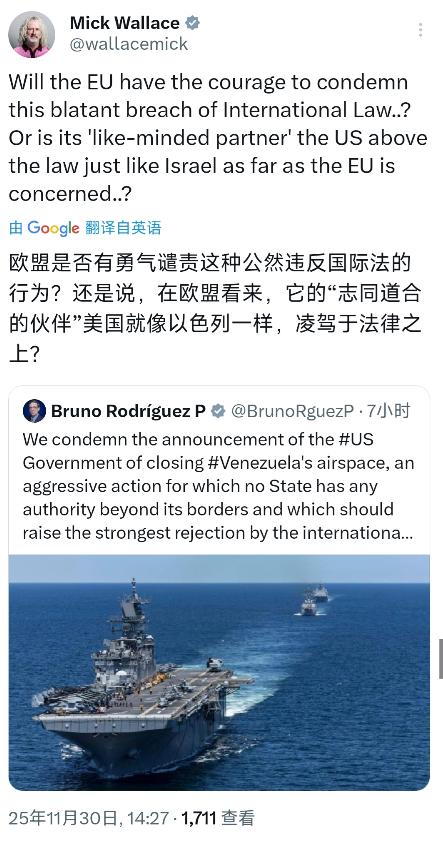 欧洲议会议员米克·华莱士11月30日发文写道:“欧盟是否有勇气谴责这种公然违反国际法的行为?还是说,在欧盟看来,它的‘志同道合的伙伴’美国就像以色列一样,凌驾于法律之上?”欧洲议会议员华莱士的质问戳破了欧盟的沉默困境:当美国宣布关闭委内瑞拉领空时,这个宣称捍卫规则的共同体选择了集体失语。 这种沉默不是偶然——看看日本首相高市早苗2025年将防卫费推至GDP2%,在与那国岛部署进攻性导弹,甚至计划修改和平宪法第九条时,欧盟何曾对这个"志同道合伙伴"的军事化动向说过一句重话?更讽刺的是,日本2024年有内阁大臣连续五年参拜靖国神社,将甲级战犯奉为"英灵",欧盟的人权报告里却只见对中俄的指责,对东亚历史修正主义视而不见。 这种双重标准的根源,在于欧盟对美国霸权的依附。 就像德国在中美贸易战时一边喊着"多边主义",一边默许美国芯片法案损害欧洲企业,当美国以"国家安全"为名践踏国际法时,欧盟的"勇气"总是选择性消失。 委内瑞拉领空事件本质上是美国门罗主义的延续,就像其支持日本在亚太扩张军力是为了遏制中国——两套剧本,同一套逻辑:盟友的侵略是"自卫",对手的反制是"威胁"。 更值得玩味的是欧盟的历史记忆偏差。 德国能诚恳反思纳粹罪行,却对日本篡改教科书、删除慰安妇历史的行径保持克制——2025年日本初中教材将南京大屠杀称为"事件",欧盟人权机构竟未发表一字声明。 这种选择性正义,让国际法沦为政治工具:当俄罗斯谴责乌克兰袭击黑海油轮时,欧盟立刻跟进制裁;当美国及其盟友干着同样的事,布鲁塞尔的麦克风就突然失声。 华莱士的提问,实则撕开了西方"规则秩序"的虚伪内核。 日本防卫费突破2%红线,背后是美国默许其突破战后秩序;美国关闭委内瑞拉领空,借口是"反恐",却忘了联合国宪章明确禁止域外武力威胁。 欧盟不是不懂国际法,只是在霸权面前,"基于规则的国际秩序"变成了"基于美国规则的小圈子秩序"。 这种双重标准,正在摧毁全球南方对多边主义的信任——当古巴外长谴责美国侵略时,欧盟的沉默,何尝不是对"规则"二字的最大背叛?更深层的矛盾在于欧盟的战略焦虑。 面对美国"亚太再平衡"的裹挟,欧洲既想分享印太经济红利,又不敢得罪金主。 就像德国明知日本扩军会激化东亚局势,却仍在2025年与日本签署防务装备合作协议——经济利益面前,历史正义和国际法都成了牺牲品。 这种短视,让欧盟在华莱士的质问前毫无还手之力:当日本海上自卫队2024年集体参拜靖国神社时,欧盟选择沉默;现在又有什么立场谴责美国?国际法的天平从来不会自动平衡。 当美国可以随意关闭他国领空,日本能公开为战犯招魂,以色列持续空袭加沙,欧盟的沉默就是纵容。 华莱士的推文不是孤立的声音,而是全球南方对西方双重标准的集体质疑。 如果欧盟继续将"志同道合"凌驾于法律之上,所谓的"基于规则"终将沦为霸权的遮羞布——毕竟在委内瑞拉领空被关闭的那一刻,所有宣称捍卫国际法的口号,都成了最刺耳的谎言。