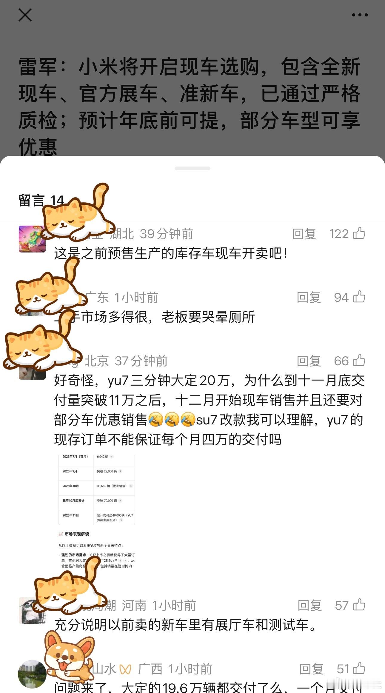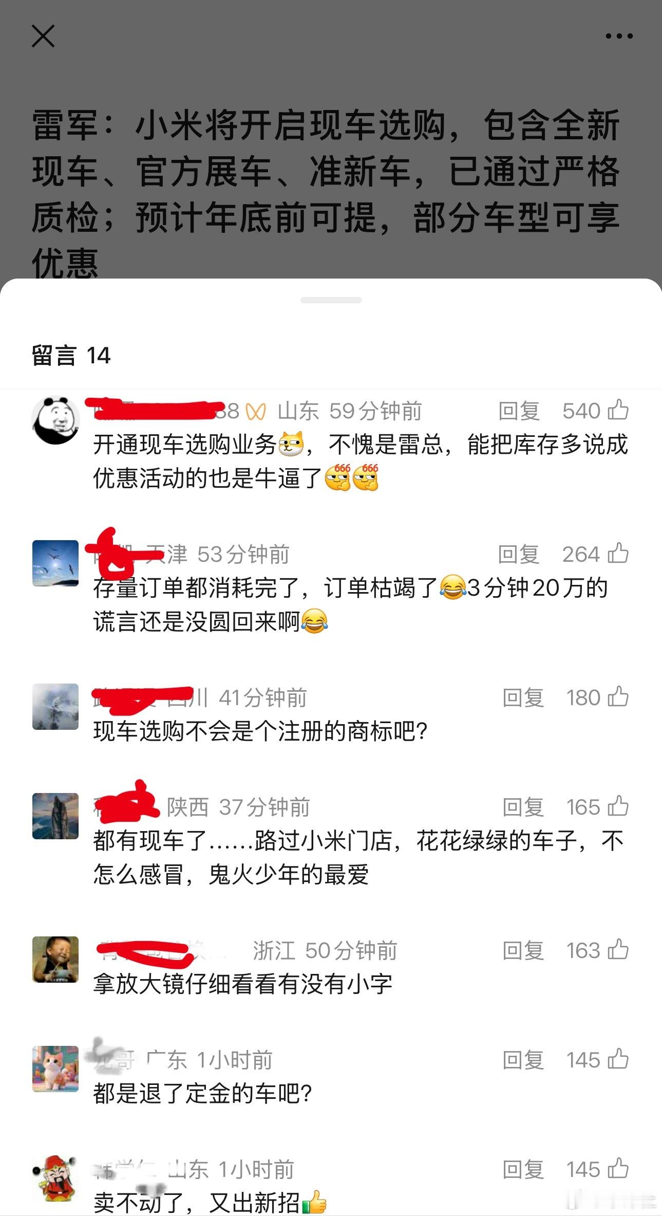 【雷军:小米将开启现车选购,包含全新现车、官方展车、准新车,已通过严格质检;预计年底前可提,部分车型可享优惠】12月1日,据媒体报道,雷军发文称小米汽车将开启现车选购。网友们不淡定了,“这是库存车吧?”“退订车?”……车评观察大v聊车 广州