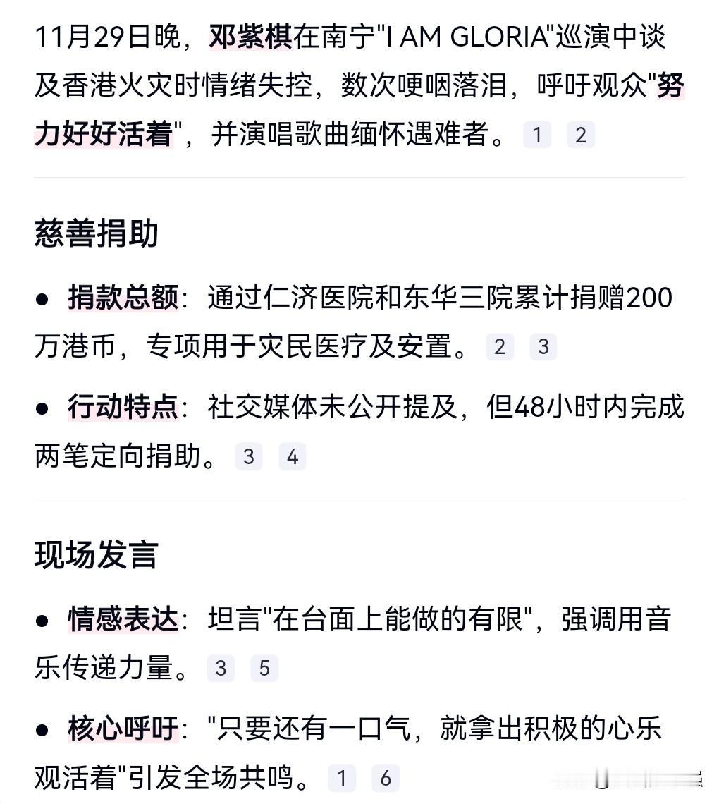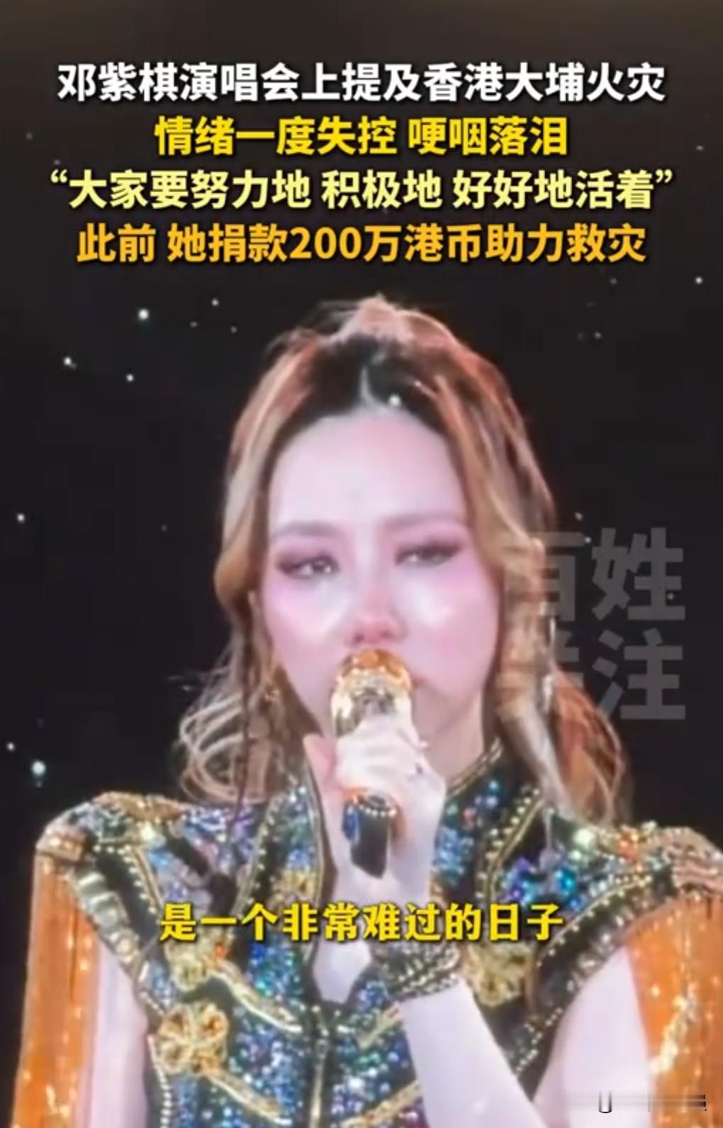 邓紫棋还挺善良的,又善良又大方。 香港这次火灾,她捐了200万港元。 11月29日,邓紫棋演唱会谈香港火灾情绪失控,情不自禁的哽咽了起来。 并希望大家都好好的活着,努力的活着。 从她哽咽到捐款,我感受到了她的善良和美好。 她的歌声也是非常的有穿透力,在音乐市场站稳了脚跟,有她的一席之地。