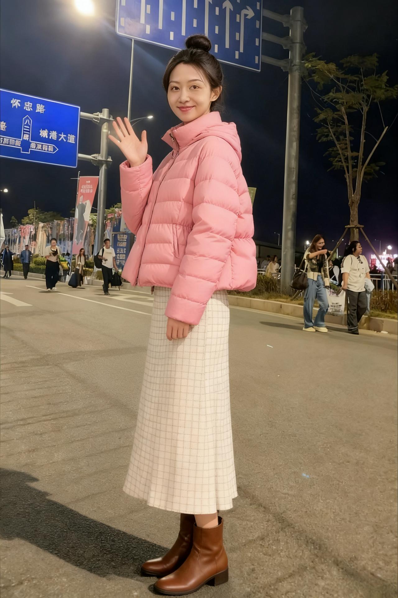 她站在街头,像一个鲜明的符号 粉色的外套是她的温度 格子的长裙是她的故事,很薄 却藏着岁月的厚重,和生活的执着 ~ 夜色是她的幕布 街灯是她的聚光灯,柔和 她不用刻意表演什么 真实的自己,本就值得被瞩目 ~ 挥手的动作不是为了引起注意 是心情刚好,她在分享这份快乐 那些关于孤独的传说 都在她的笑容里,不攻自破