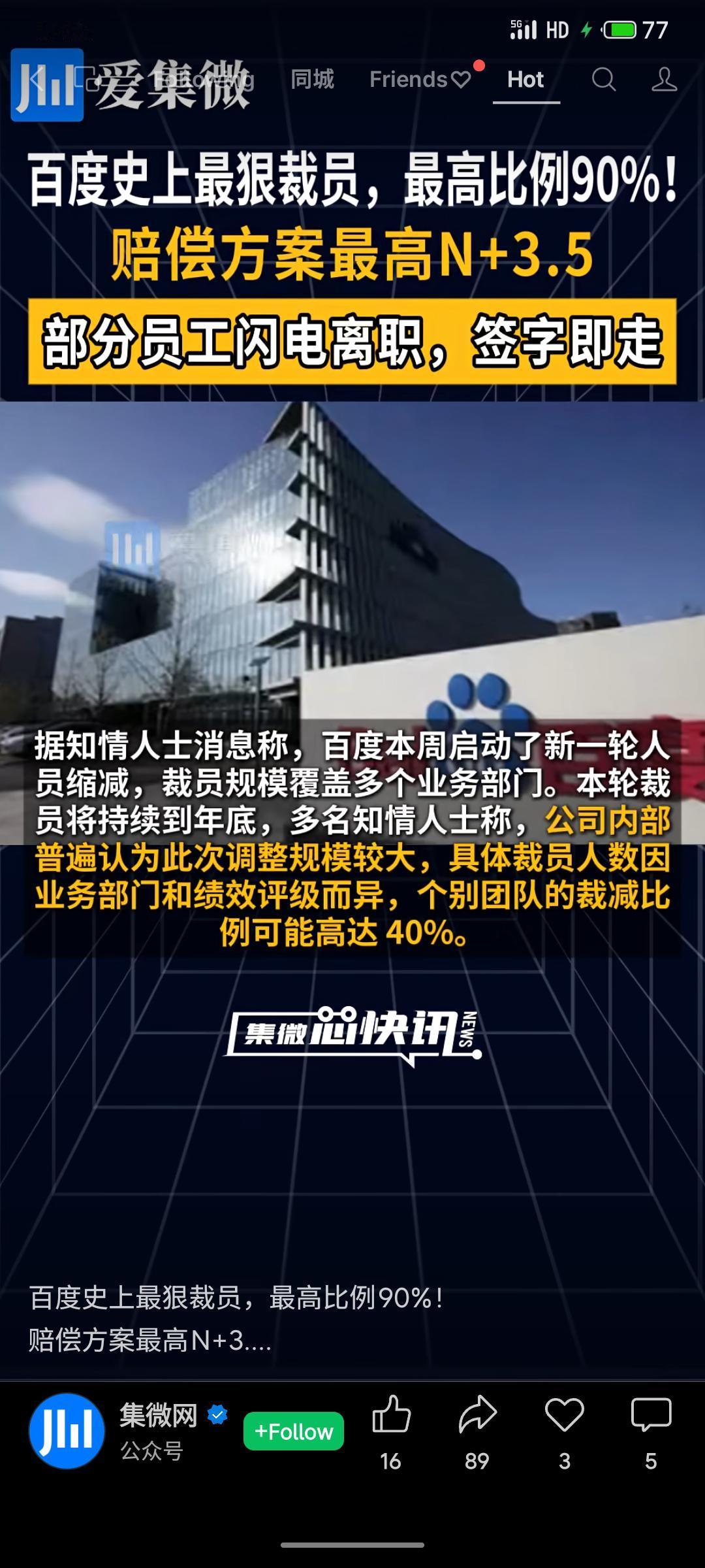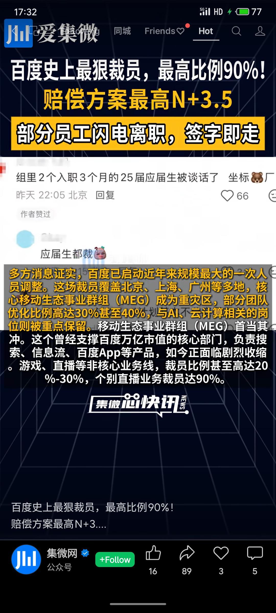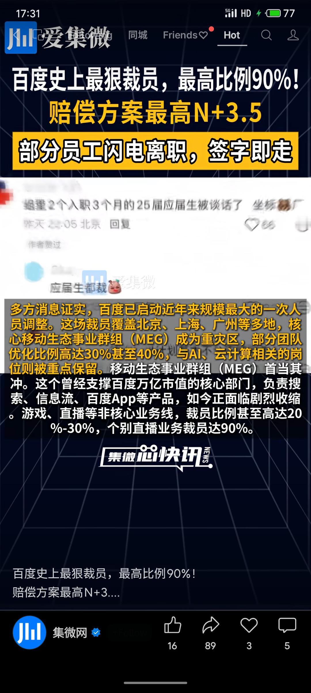 据多方消息,百度近期启动大规模人员调整,裁员覆盖多地,以移动生态事业群组(MEG)为核心重灾区,部分团队优化比例达30%-40%,非核心业务如直播个别裁员比例高达90%。裁员对象主要涉及入职不满一年的新人、高龄员工及低绩效人员,赔偿方案为N+1.5至N+3.5不等,部分员工可闪电离职。与此同时,与AI、云计算相关的岗位被重点保留。