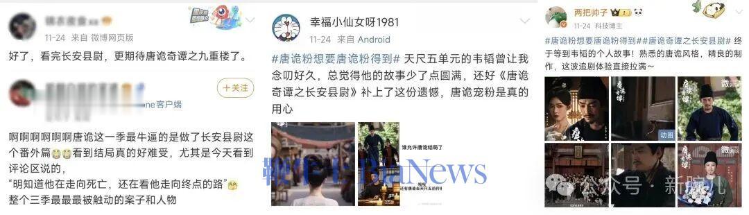 此外,微剧的各种细节也处处呼应长剧。长剧中卢凌风的帮手——长安县捕手“唐诡三冤种”一出场,弹幕立马炸了,满屏都是“熟悉的感觉又回来了!!!”老粉们一边狂喜,一边给刚入坑的新观众“划重点”,科普人物关系和唐诡故事。