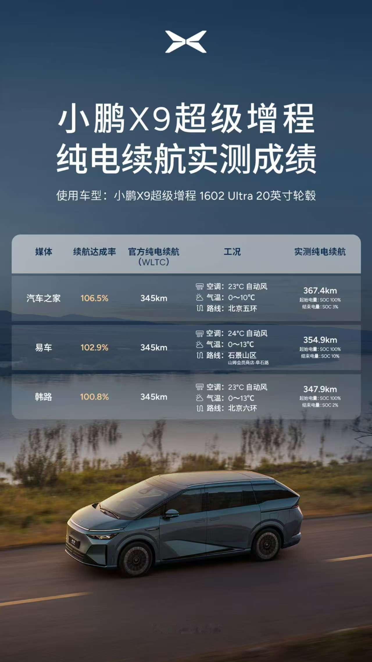 小鹏X9超级增程版的纯电续航,几大媒体实测均为350km以上,包括汽车之家367.4km、易车354.9km,都超过了工信部标称WLTC 345km。大车这个续航完全够用了,日常通勤、周末出游都没问题,一周充一次妥妥的。小鹏X9超级增程“大电池+增程”这个路线相当对。两大垂媒实测小鹏X9续航反向虚标