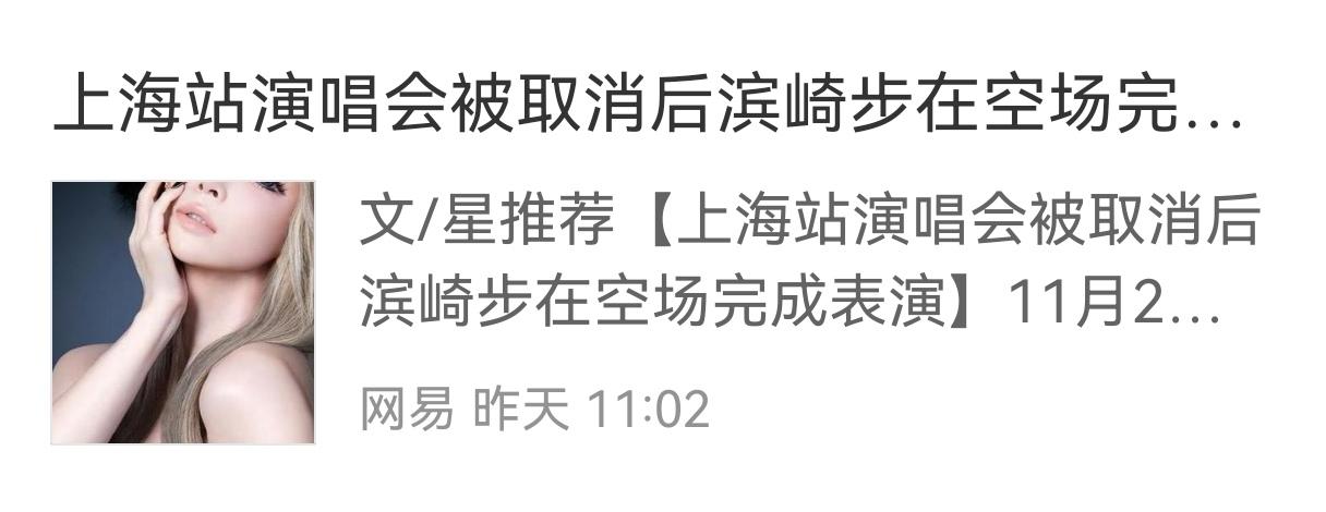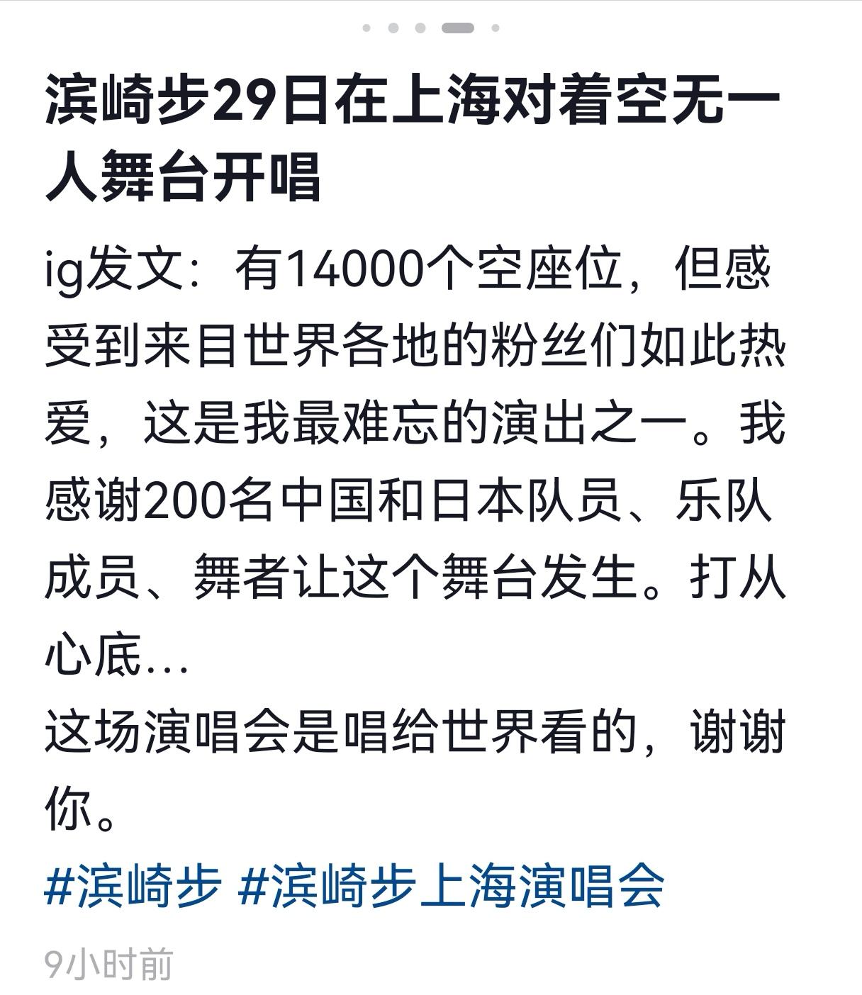 11月29日铺天盖地的文案是这样的:滨崎步29日在上海对着空无一人舞台开唱,或者是敬业精神加契约精神就是国际精神。很多网友也转了滨崎步自己发在ins的贴文,从她贴文的描述中可以看出,她确实对着一万四千个空座位自己唱完了整场。当时还有人解释空场馆演唱的时候录了视频,适当的时候把视频放到网上卖钱。当时我就纳闷,既然不可抗力,那肯定连场馆都不许进,哪里会有“在空场馆开唱”的骚操作呢?这是把大家当白痴吗?果然,今天这台高歌“契约精神”的戏唱不下去了,必须找一个人来背锅,因为所有工作人员都是临时工,所以这次就指定让摄影师来做背锅侠吧。