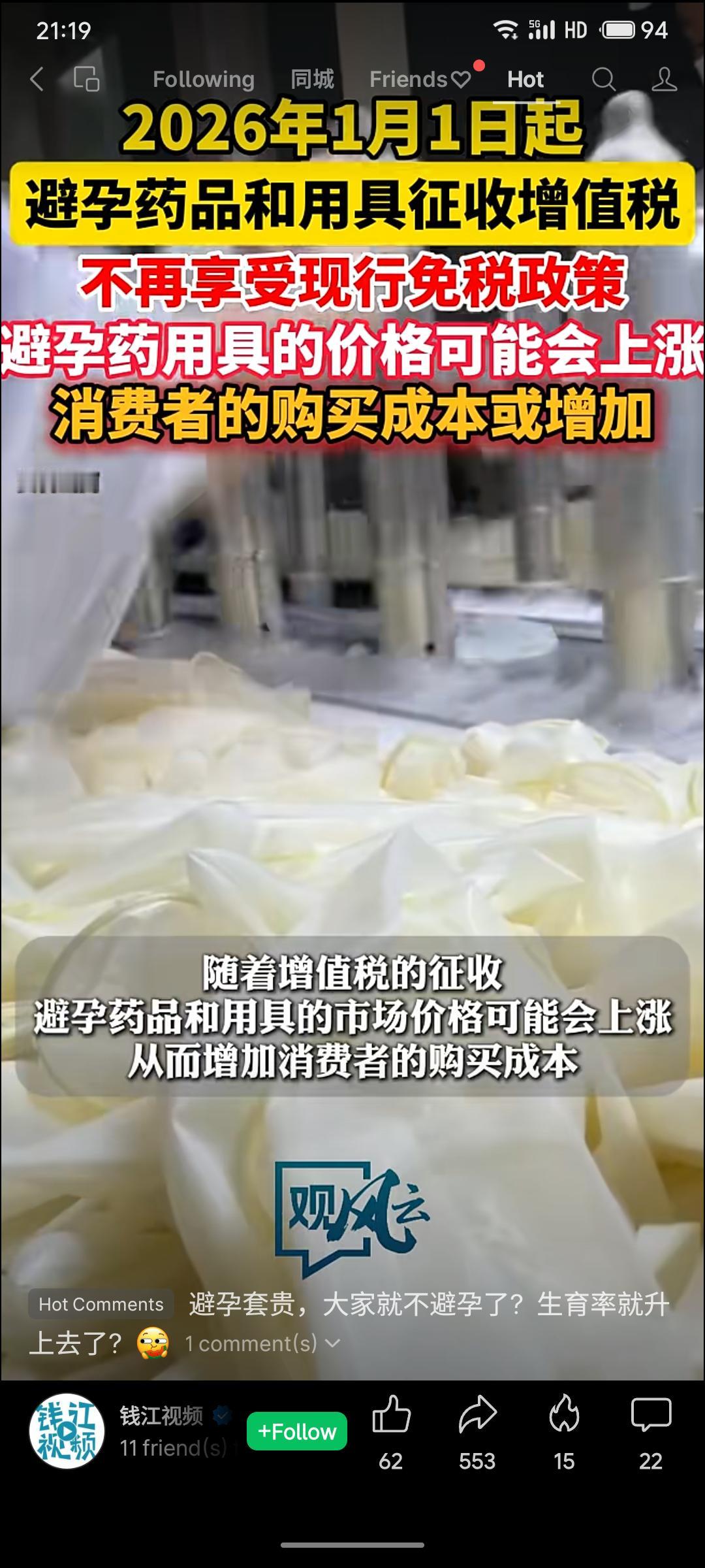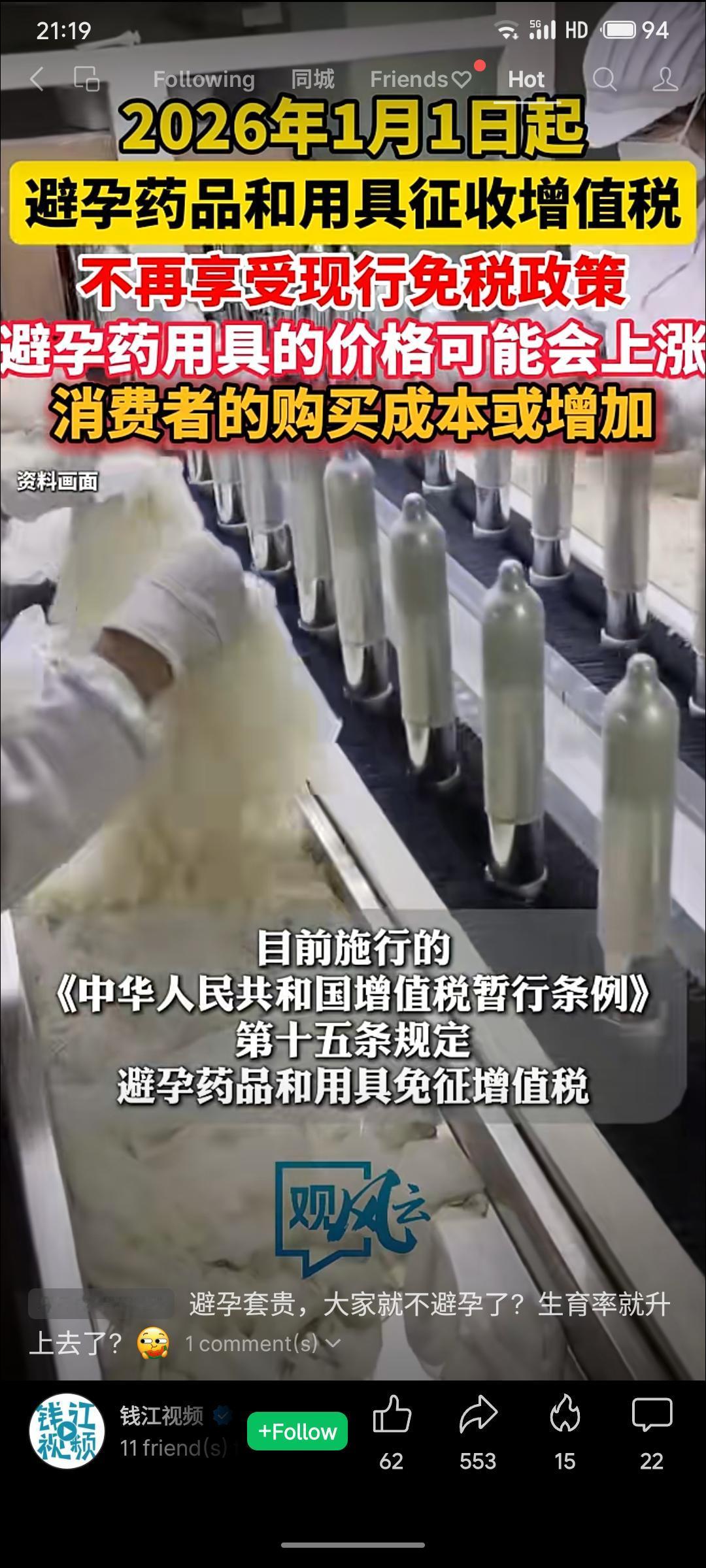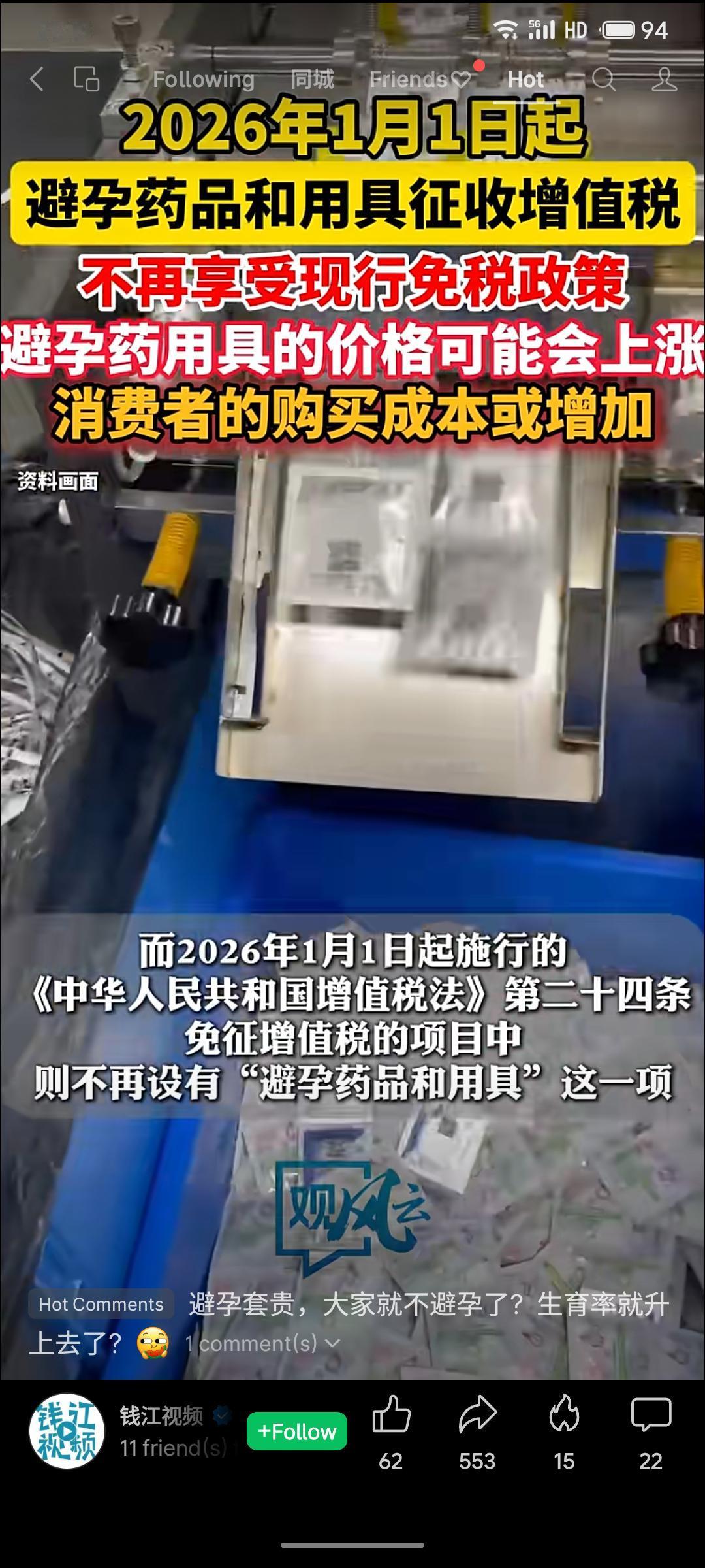 自2026年1月1日起,避孕药品和用具将不再免征增值税,恢复按法规征税。此举意味着其市场价格可能上涨,消费者购买成本或将增加。报道提及网友对此的热议,有评论担忧“避孕套收费”可能影响避孕行为与生育率。政策依据是即将施行的《中华人民共和国增值税法》相关条款。