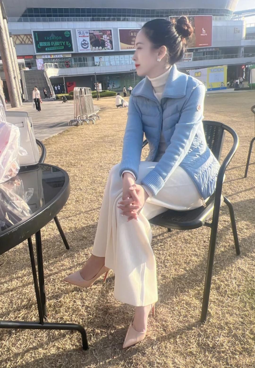 电梯里的优雅时刻,蓝白配色的清新穿搭