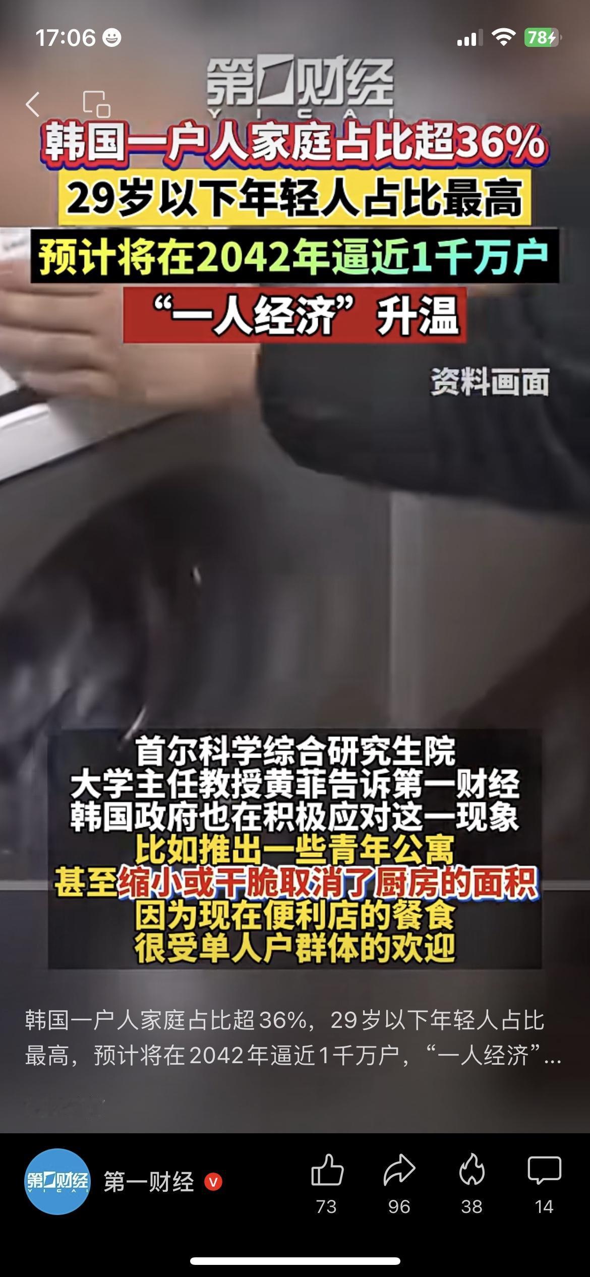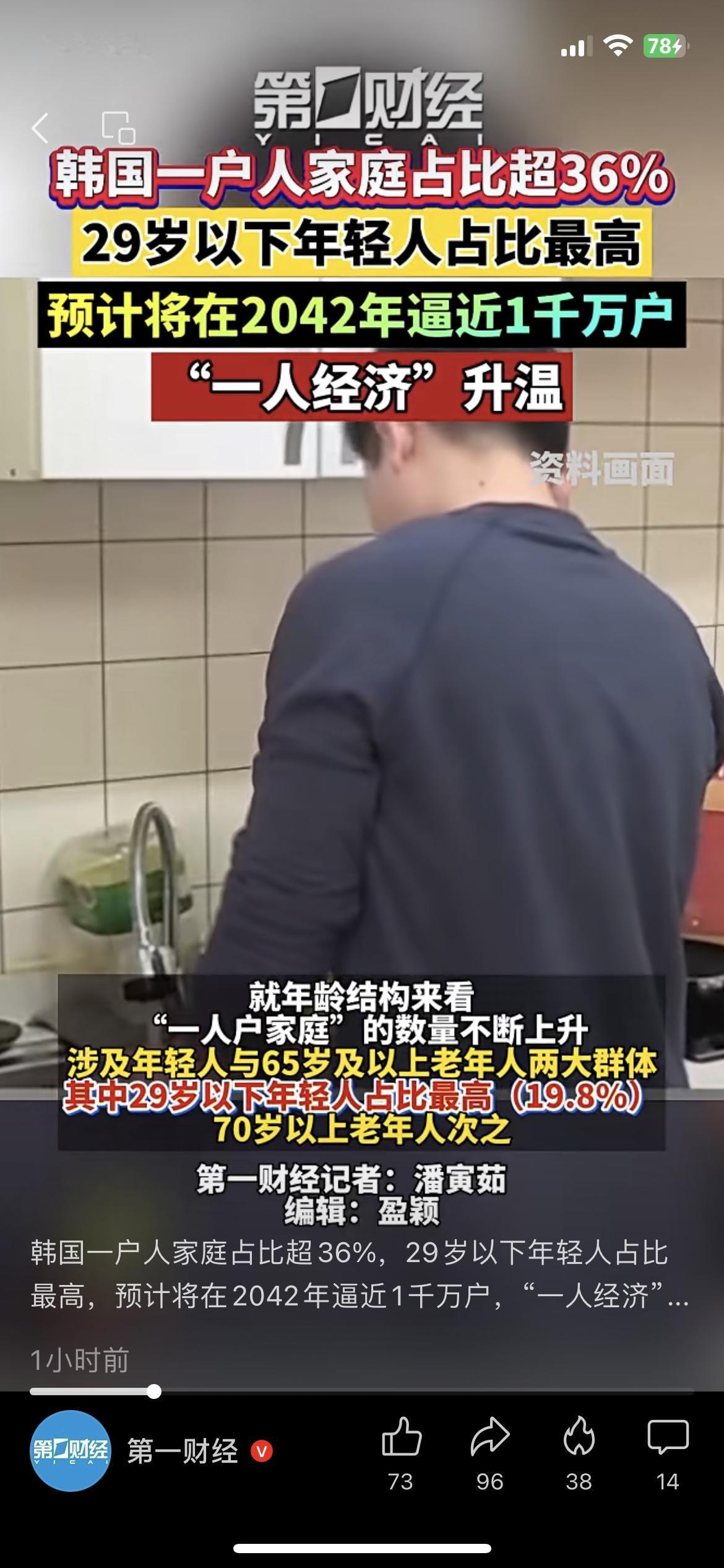 韩国快一半都是“独居族”了?1人户家庭占比超36% “韩国的‘一人经济’越来越火了——现在1户人家只有1个人的比例已经超过36%,其中29岁以下年轻人占比最高,70岁以上老人也不少。 预计到2042年,韩国一人户家庭能接近1000万户。 你们身边独居的人是不是也越来越多了?韩国百姓