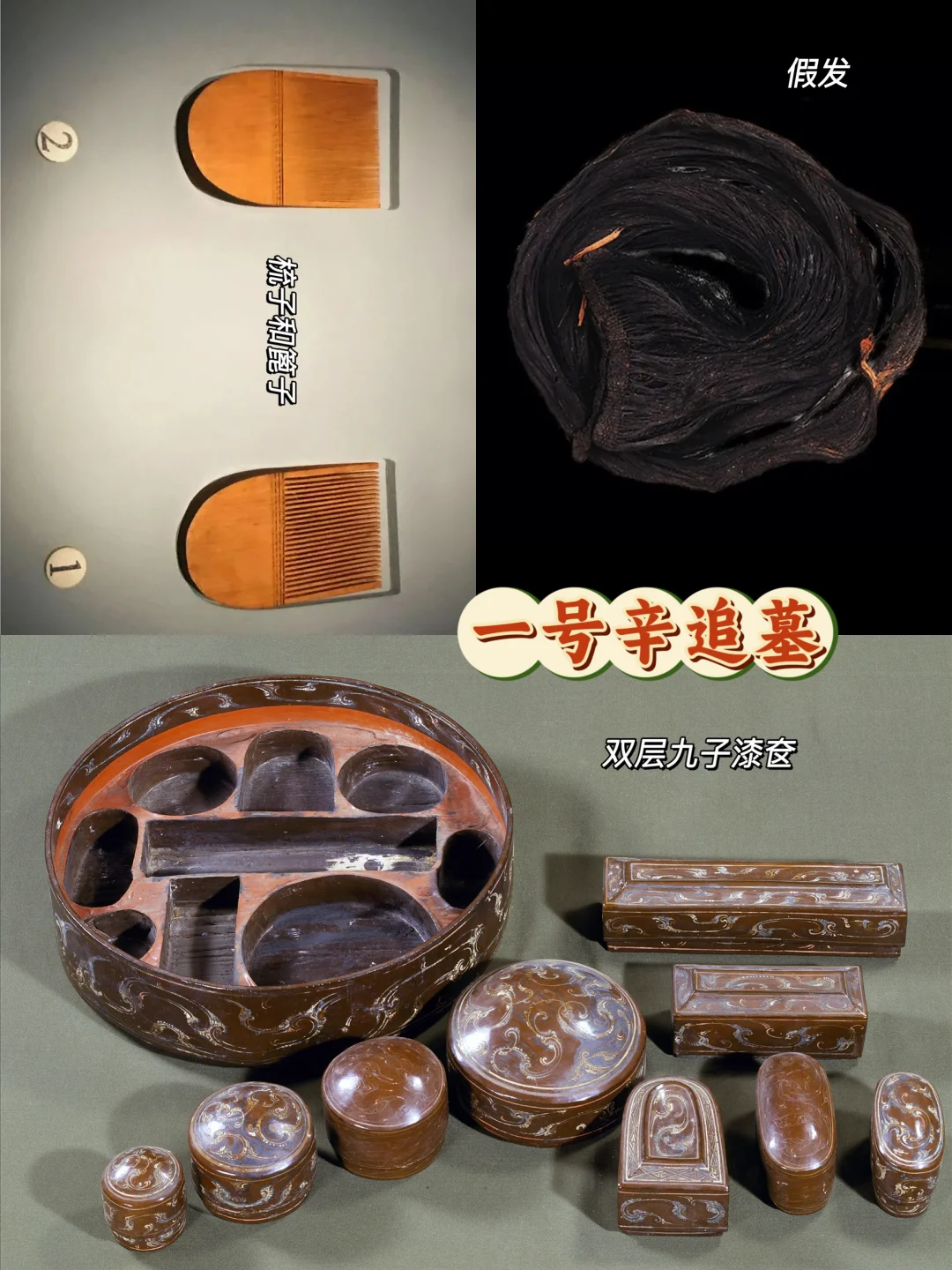 这里还出土了许多漆器,有一化妆盒,能容纳九件小物,像梳子、粉扑、粉刷、香粉、胭脂都不在话下。