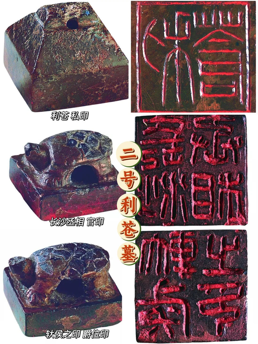 🔸说完了精致贵妇,再来看她的老公,二号墓主人利苍。之所以能确认他的身份,来源于三个印章,一枚玉印刻着他的名字,两枚龟形鎏金铜印,分别显示出他的爵位与官职。