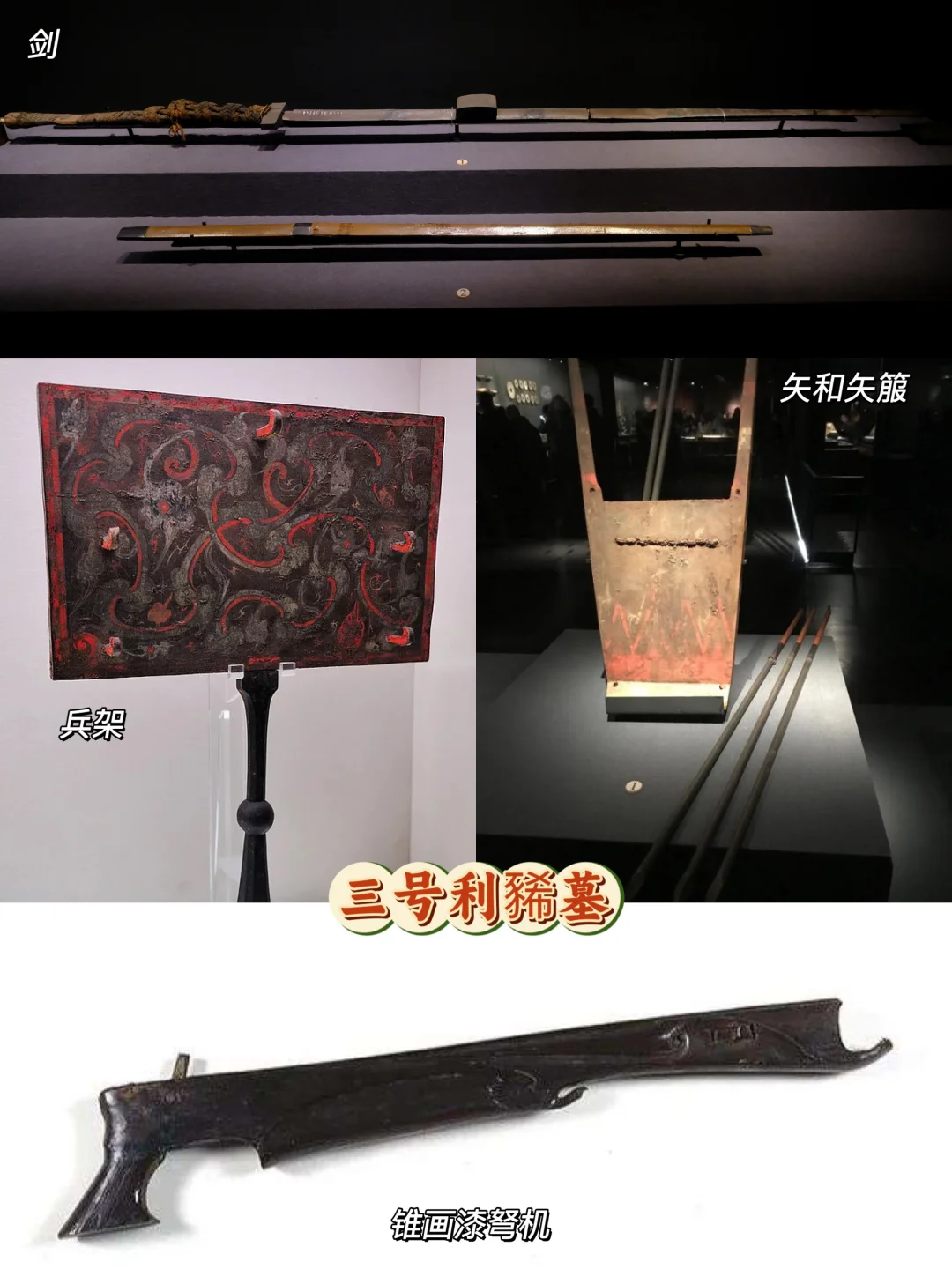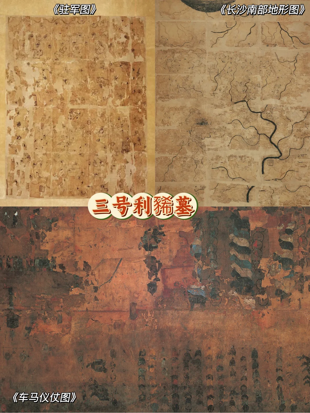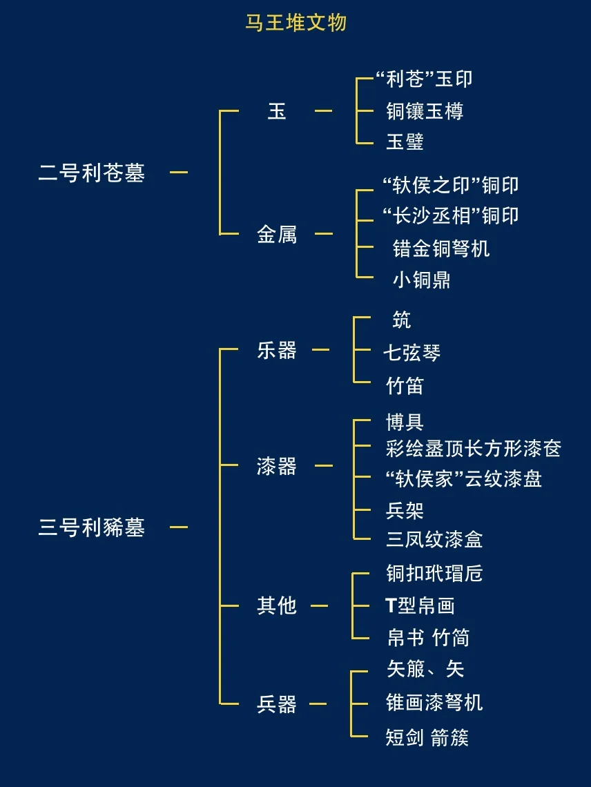 🔸利苍逝世后,十三、四岁的长子利豨继承了爵位,他便是三号墓墓主。利豨在位期间,主要功绩是镇守长沙国边境,抵御南越国入侵。因此,他留下了《车马仪仗图》、《驻军图》,以及38件兵器,包括剑、矢、弓、弩、戈、矛等。