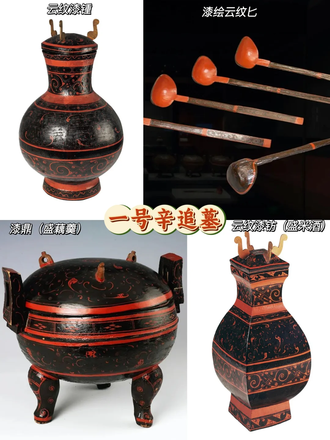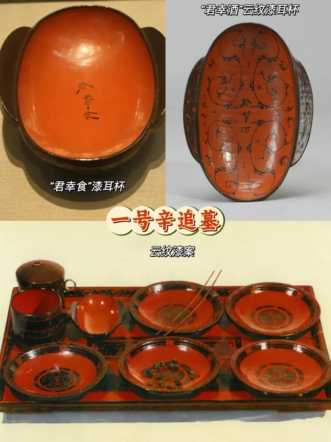 🔸盛放它们的餐具多为漆制,写有“君幸酒”和“君幸食”,上面绘制着纤细的几何、龙凤、云气纹,灵动不失严谨。