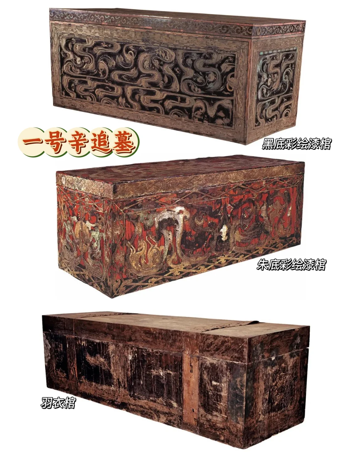 🔸1号墓由四层套棺组成,外部漆棺绘有珍禽异兽、奇幻仙境,内里黑棺表面粘贴着羽毛!