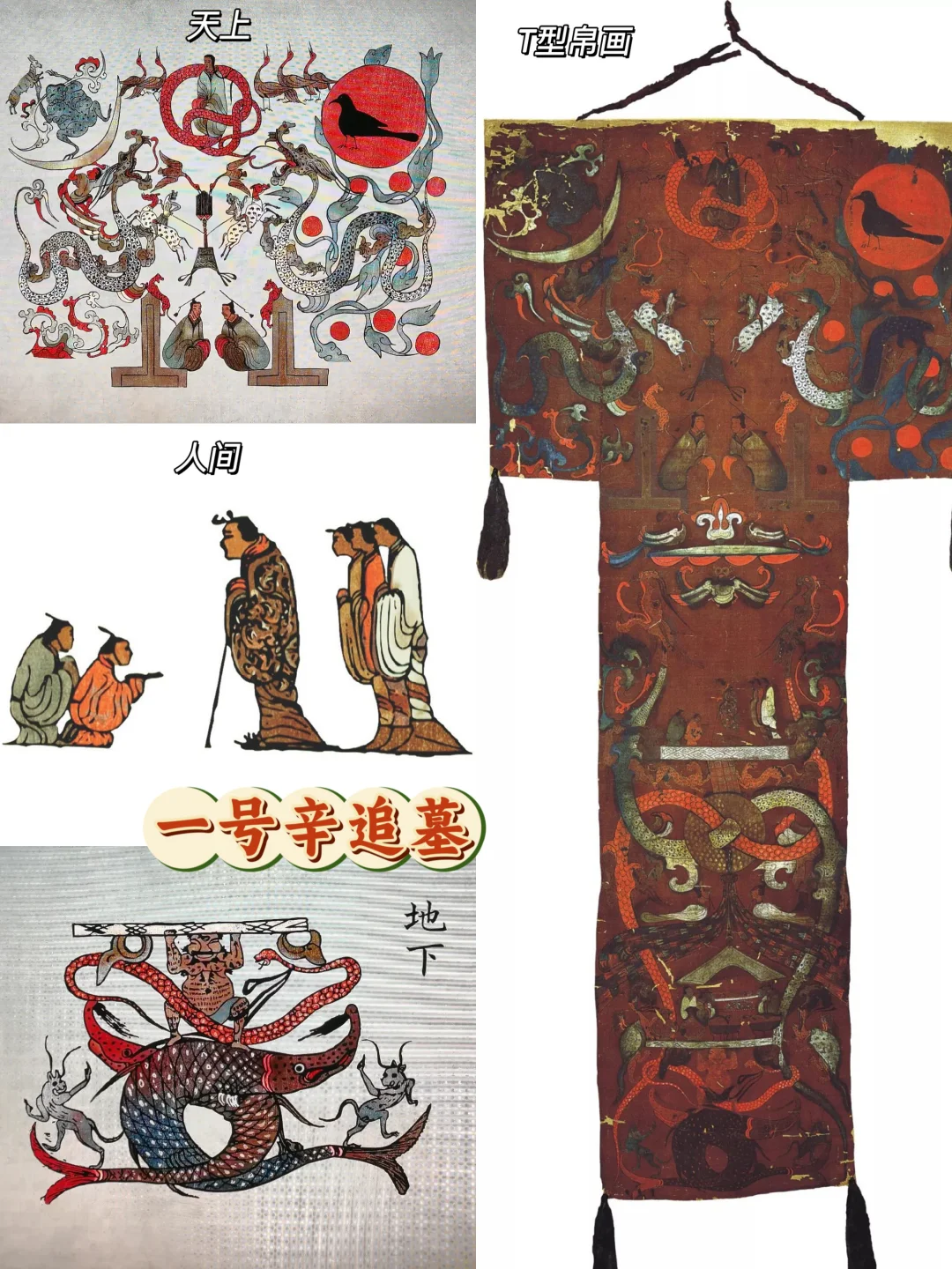 羽衣棺上盖着T形帛画,描绘了地下海神鸱龟,人间墓主祭祀,双龙穿璧,羽人指引,神豹通天,天上女娲镇守,神树挂阳,新月卧兔,而墓主之灵,正在乘龙升仙呢。