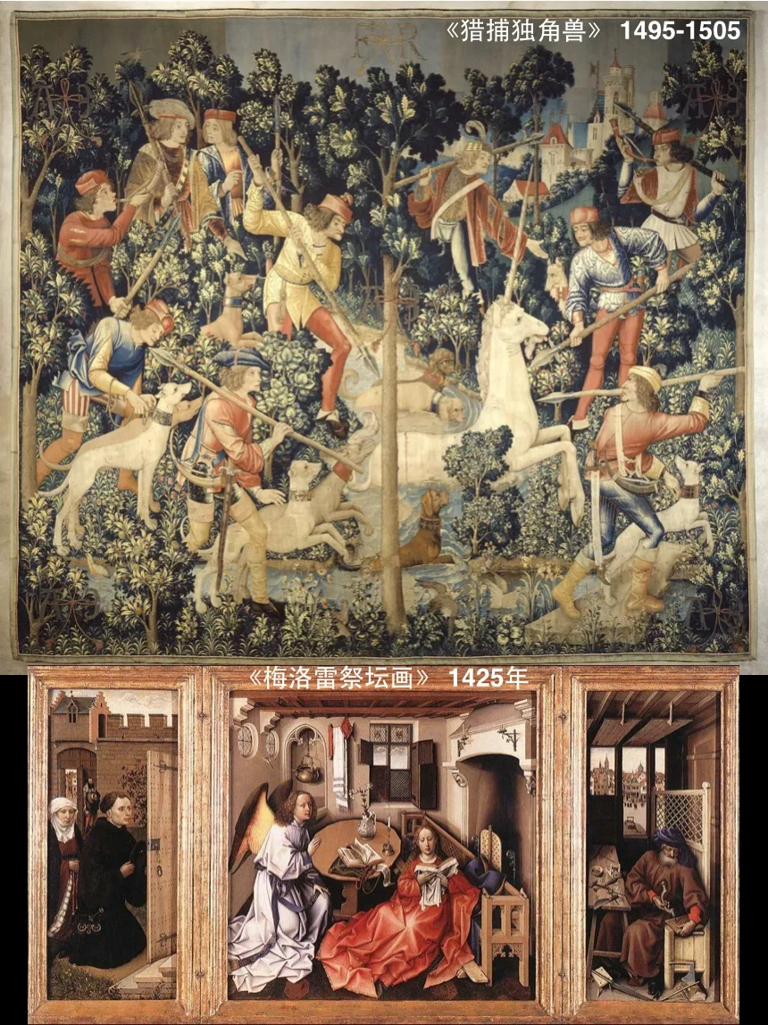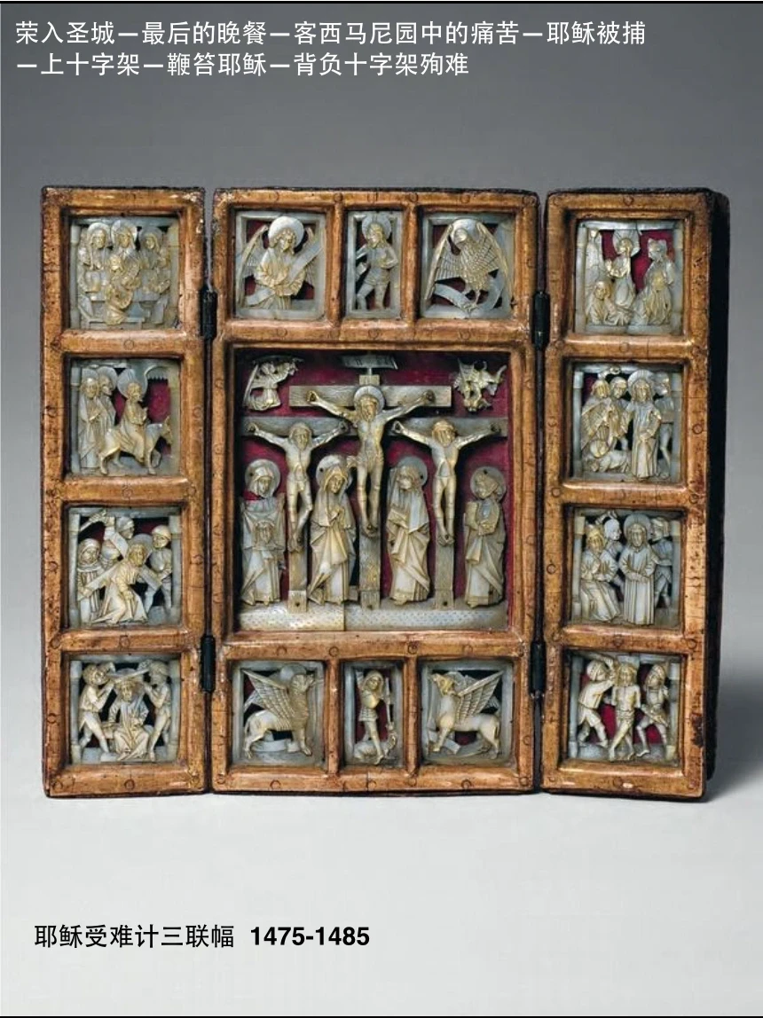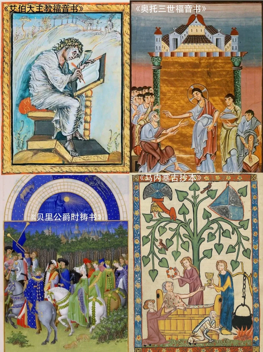 ♦️中世纪艺术表现形式:时祷书、三联幅、圣物盛器、挂毯、彩色玻璃、教堂雕塑、祭坛画。