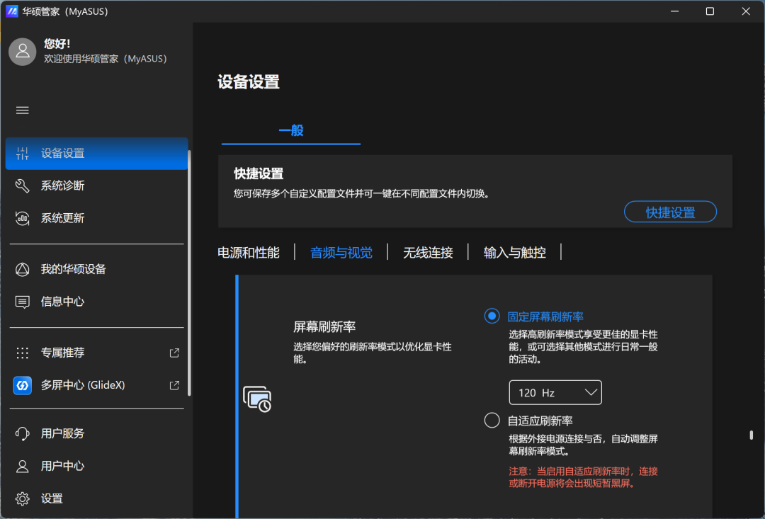 打开【华硕管家MyASUS】,依次进入【设备设置---屏幕刷新率---选择“固定屏幕刷新率”】。插拔电源时就不会黑屏一下切换刷新率咯!