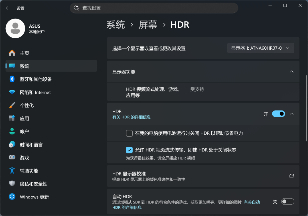 依次点击【开始---设置---系统---屏幕---HDR---取消勾选“在我的电脑使用电池运行时关闭HDR以帮助节省电力”---关闭“自动HDR”】。插拔电源时就不会黑屏一下切换HDR/SDR模式咯!