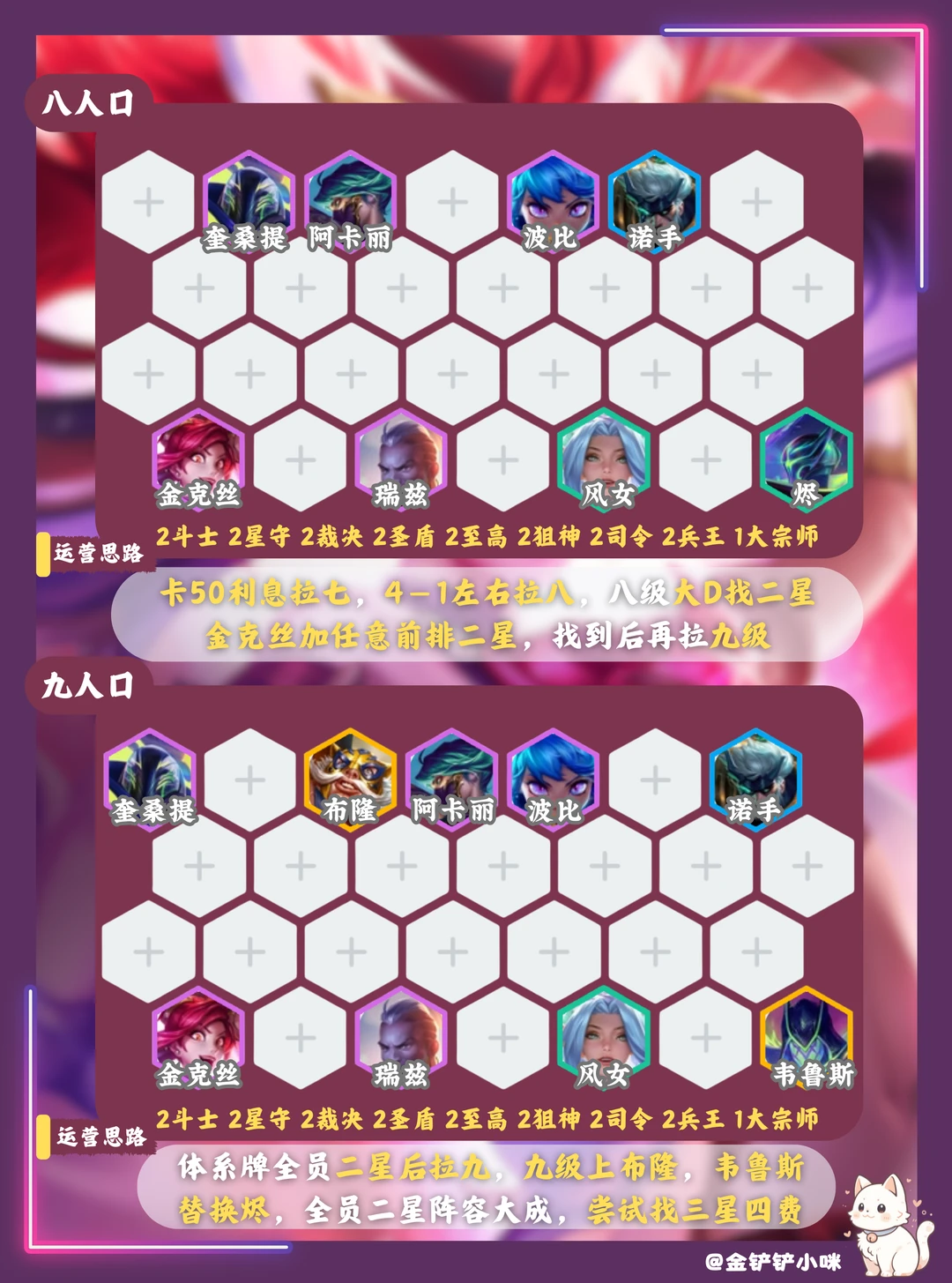 4️⃣阶段4-1左右拉八,大D找二星金克丝加任意前排,找到后可以准备拉九,血量不健康就D到全员二星再拉九