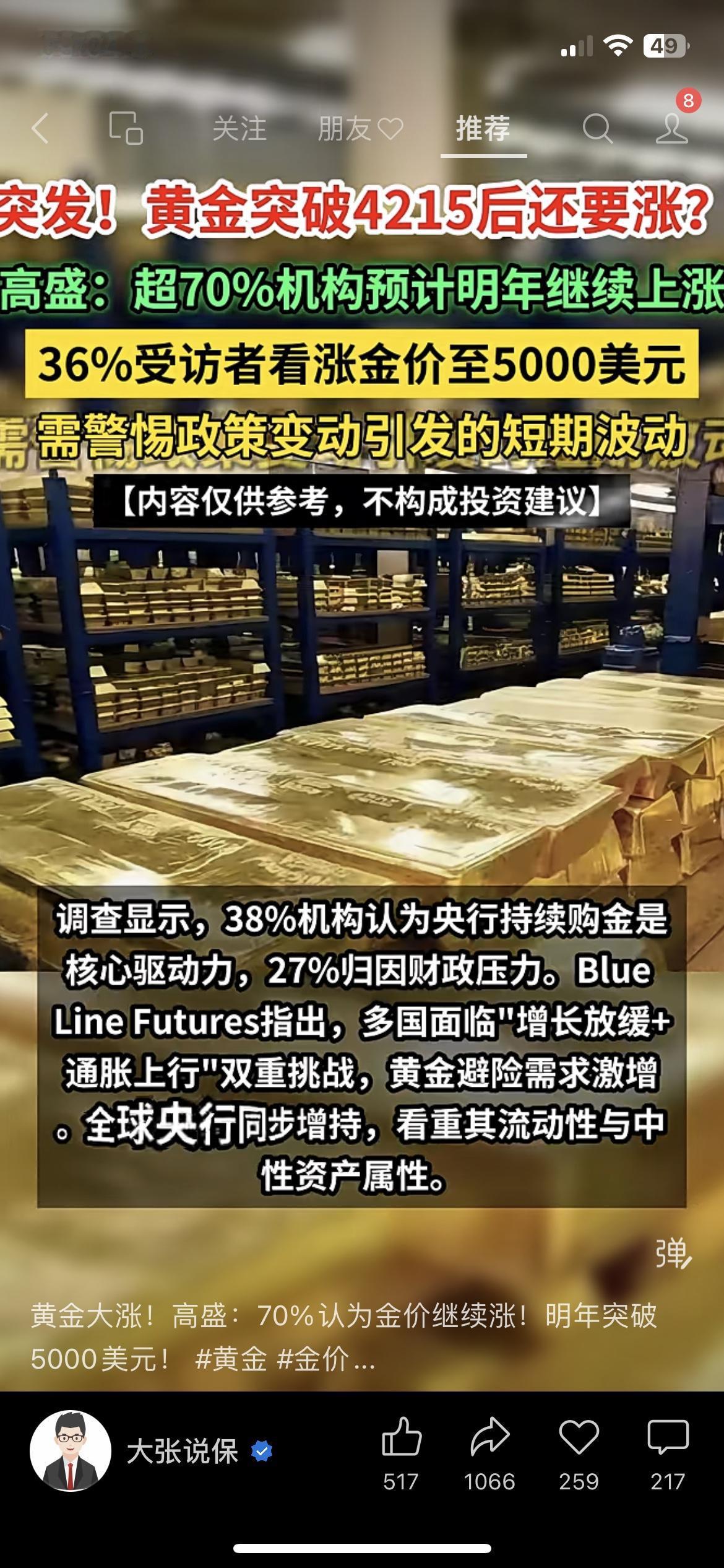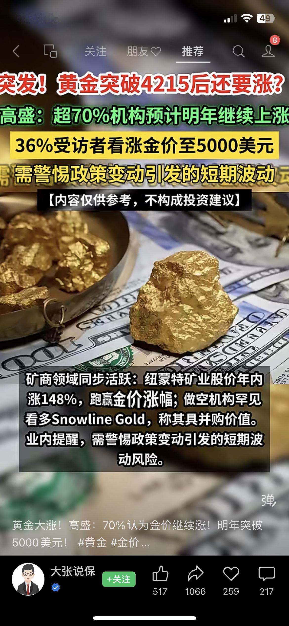 炸了!黄金直接冲到4215!高盛喊:70%机构看涨,有人说要破5000美元! 兄弟们,黄金这波真的疯到没边了!刚刷到金价直接干到4215,高盛那边立马放话:现在超70%的机构都笃定明年金价接着涨,更狠的是,36%的人直接喊要冲到5000美元/盎司! 不光金价涨,卖黄金的公司比金价还疯——纽蒙特矿业今年股价直接飙了148%,比金价涨得还猛!连之前做空的机构都改口,说有个叫Snowline Gold的公司大概率要被并购,值得盯! 不过也得提一嘴:要是政策变了,金价可能突然波动,咱看看热闹就行,别盲目跟风啊! 你觉得这黄金能涨到5000吗? (内容仅分享市场消息,不构成任何投资建议哈)黄金行情价格