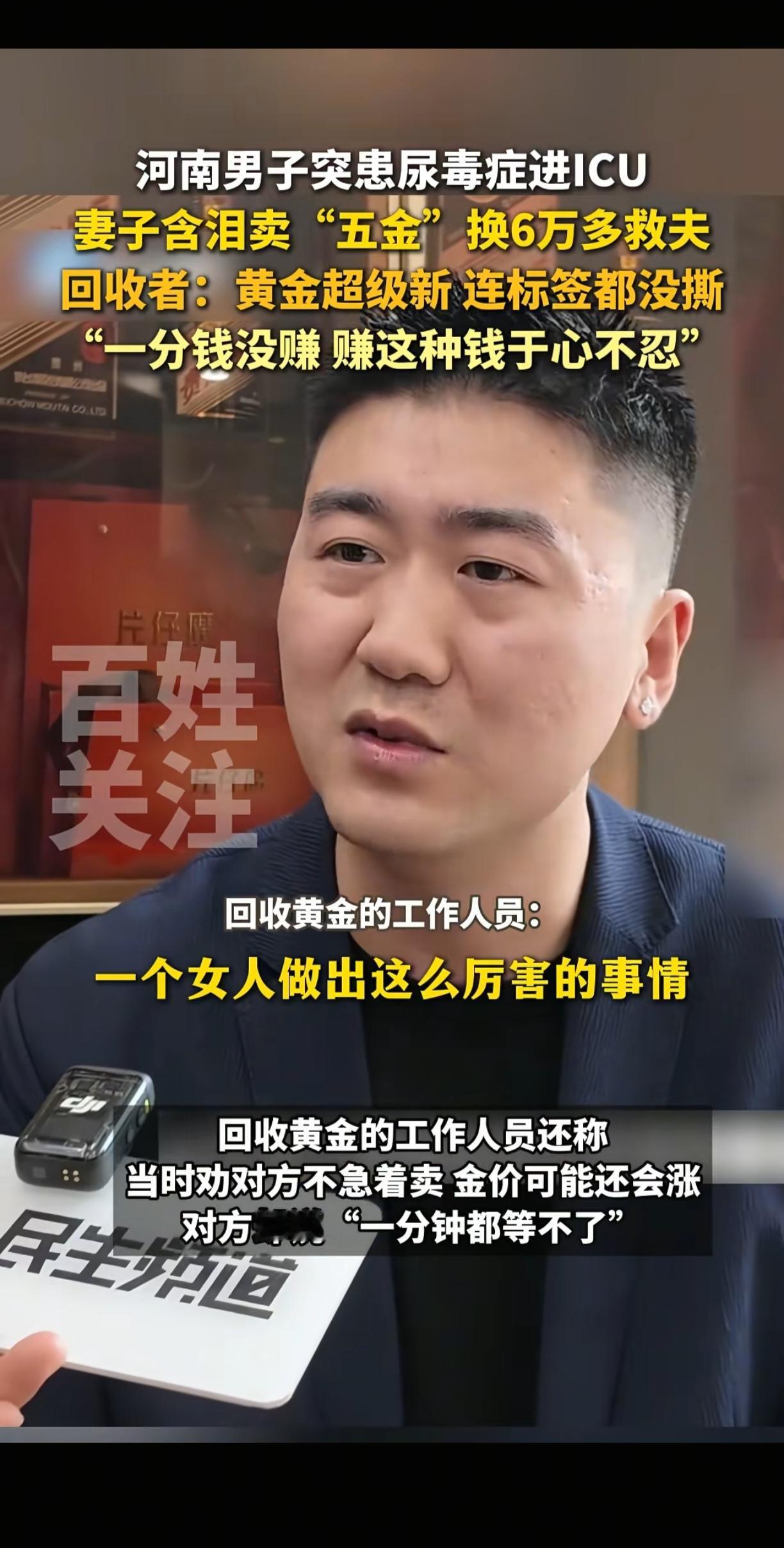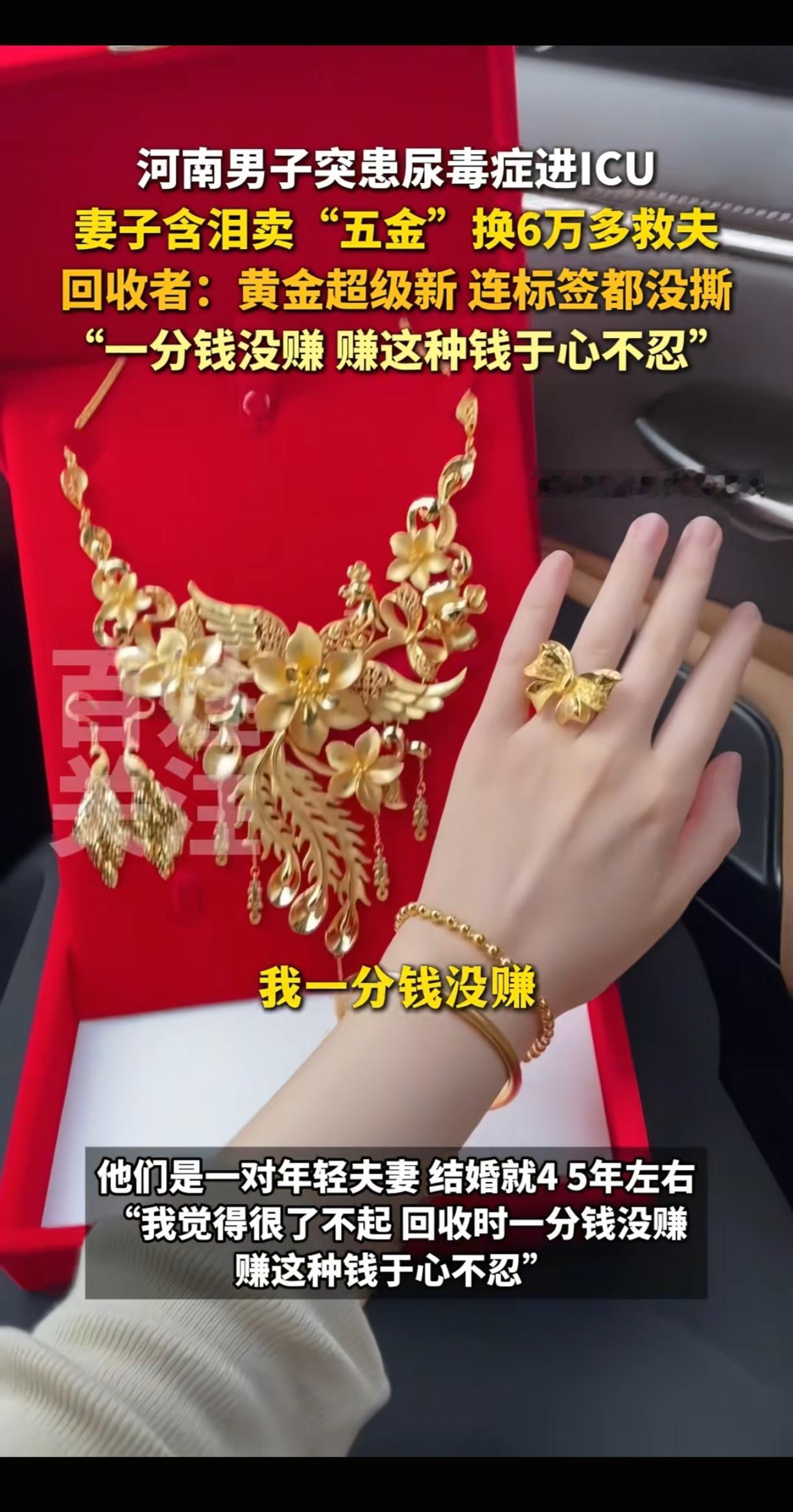 河南,丈夫突然患上尿毒症,被送进ICU抢救。新婚不久的妻子,拿着崭新、标签都还没撕掉的金首饰,急匆匆的去售卖。回收店里,老板看着金首饰,问道:“这么新,都没戴过,为啥急着要卖呀?金价还会涨的。” 女子和丈夫刚结婚没多久,本以为能开始甜蜜的小日子,可丈夫突然倒下,住进了ICU。那些金首饰是男方家给她的“五金”,是结婚时的念想,标签都没撕,却要为了救命卖掉。老板看出她的难处,按高价给了她六万多块,还说赚她的钱于心不忍。 拿着钱,女子赶紧往医院跑。可ICU的费用像流水一样,六万多很快就见了底。医生说后续的透析和治疗还需要一大笔钱,女子站在医院走廊,眼泪直流。她不知道还能去哪里找钱,亲戚朋友能借的都借了,自己也没什么积蓄。 这时,有人把她卖首饰救夫的事传到了网上。一开始,有不少人质疑,说是不是在作秀,好好的金首饰干嘛急着卖。女子看到这些评论,心里特别难受,她把丈夫的诊断证明、ICU的缴费单都发了出来,“我只是想救我老公,没别的心思。” 好在更多的人选择相信她,还有人主动联系她,给她捐钱,帮她打听便宜的透析医院。当地的一些爱心组织也伸出了援手,帮她筹集后续的治疗费用。 丈夫的情况慢慢稳定了些,虽然还需要长期透析,但女子觉得有了希望。她常说,不管多难,只要能和丈夫一起扛过去,就值得。那些质疑的声音,在大家的善意面前,也渐渐没了声响。而那位回收金饰的老板,也因为善良的举动被大家称赞,他说,谁遇到这种事都不容易,能帮一点是一点。 各位读者你们怎么看?欢迎在评论区讨论。 来源:百姓关注 2025-11-4发布