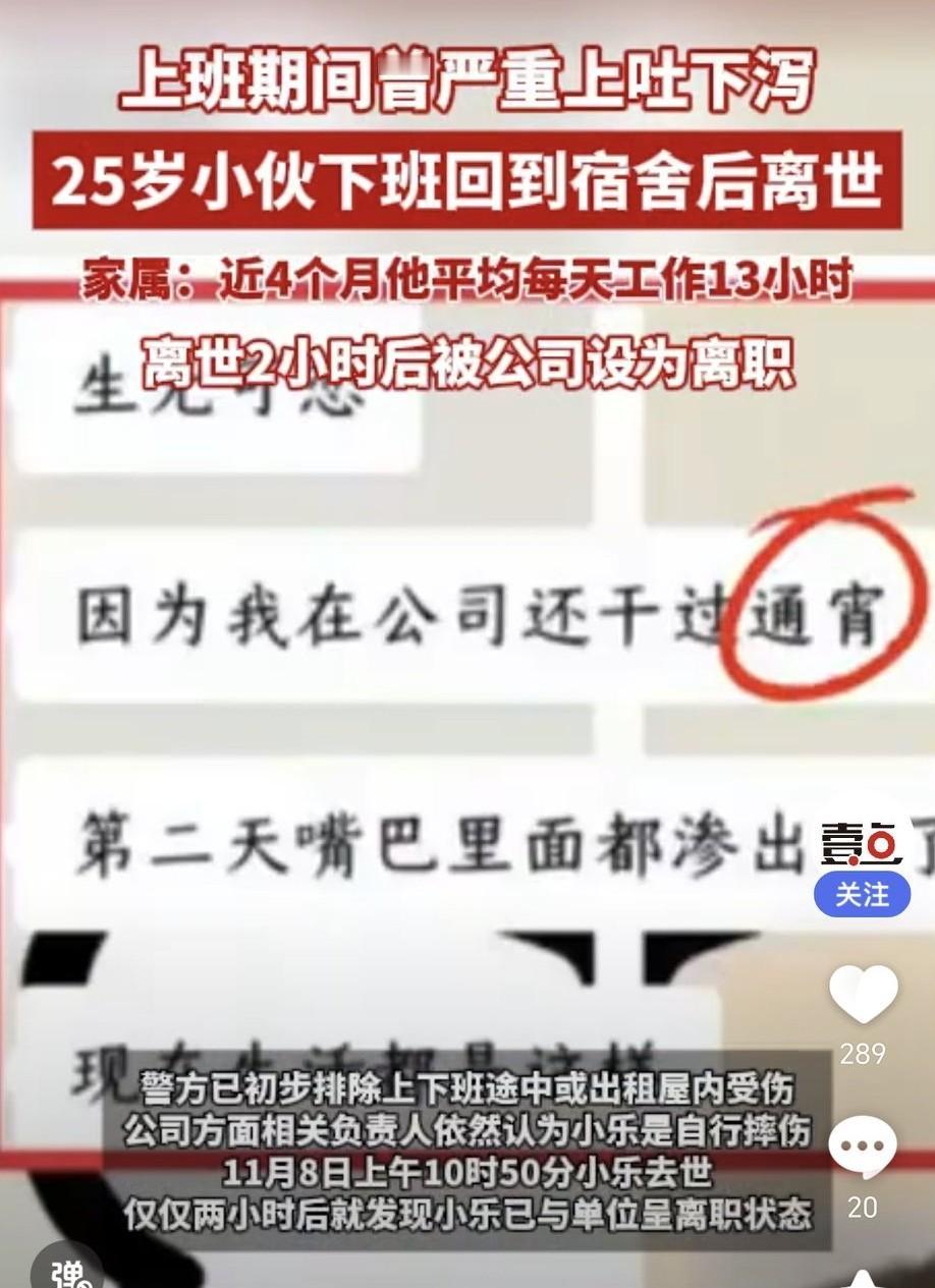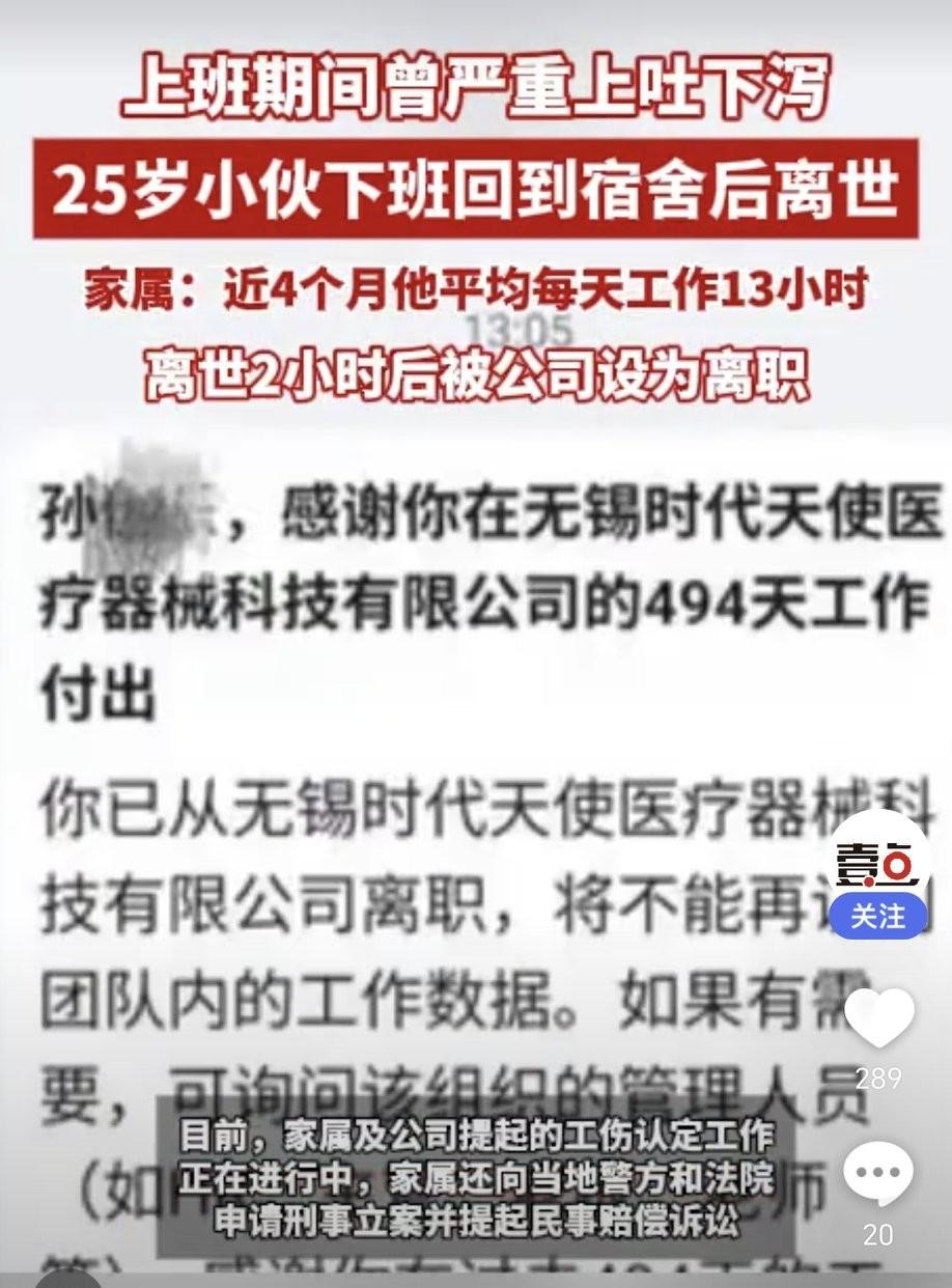 25岁本是青春正好的年纪,陕西韩城小伙小乐的生命却戛然而止。他大学毕业后入职无锡一家医疗器械公司一年多,近四个月平均每天工作13小时左右,最长达14.8小时。他曾向朋友吐槽“累到嘴里渗血,流鼻血”,出事那天他在公司上吐下泻,坚持到下班回到宿舍后离世。 更让人气愤的是,他离世两小时后公司就将其设为离职。公司称他是自行摔伤,可家属觉得是过度加班压垮了他。目前工伤认定在进行中,家属也申请刑事立案和民事赔偿诉讼。 A网友:无锡时代天使医疗器械科技有限公司拿别人的命来发展的公司,我倒想看看最后会发展成什么样? B网友:唉!这公司一点人性都没有、造孽啊!世人都被利益蒙住了双眼,上天给了我颗普度众生的心,奈何没给我法力,生的伟大,活的憋屈。 C网友:身体信号如持续出血、眩晕需被严肃对待。工作是为生活,而非以命换钱。如此有“周扒皮味”的公司,冷漠得让人寒心,大家一定要记住啊! 现在很多公司只为利益把人当机器用,这种事情太多了,还有12小时夜班猝死的,大家一定要好好休息,充足的睡眠、阳光,好好吃饭就是最好的养生。希望真相早日大白,给家属一个公道。