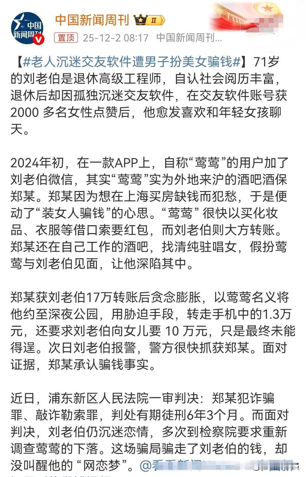 老年人也是非常渴望爱情的,男人只有挂在墙上才老实,这也是有一定道理的。 老人沉迷交友软件遭男子扮美女骗钱,这骗子实在是太恶劣了,不仅骗钱而且还敲诈勒索,最终被判有期徒刑好几年。这真是大快人心。 而老人却还深陷网恋当中,一直在寻找所谓的“爱人”,其实那个见面的女生是男子找人冒充的。 和老人聊天的一直都是这个男子。