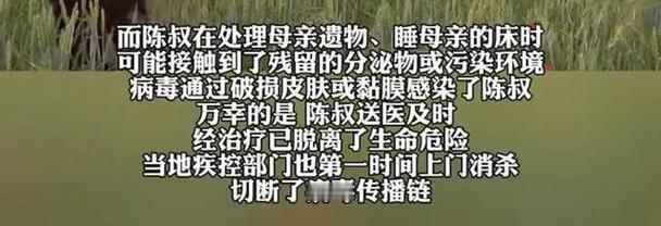 86岁老母刚走,儿子就“撞了邪”!浙江陈叔按习俗睡亡母床铺,结果高烧腹泻,症状和母亲一模一样。医生一查,两人竟感染同种病毒——新型布尼亚病毒! 原来这病毒能通过接触传播,母亲务农时可能被蜱虫叮咬,病毒留在床铺上,儿子睡上去就中招了。专家提醒:接触逝者遗物务必消毒,户外活动要防虫,出现症状赶紧就医! 传统习俗要尊重,但科学防护不能少。这“压鬼床”压出真病来,可不是闹着玩的!转发提醒家人:心意要尽,健康更要保!