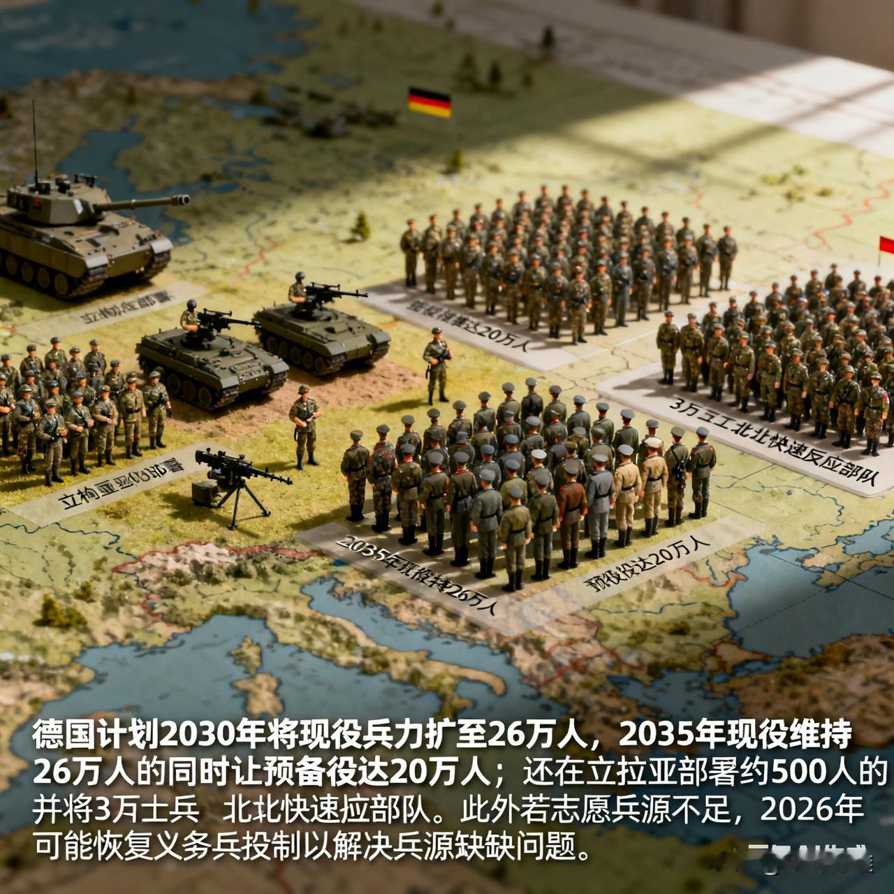 2025年德国联邦国防军正处于扩军改革阶段,当前现役相关规模清晰且扩张计划明确,具体如下: 1. 现役及文职规模:截至2025年3月,现役军人约18.2万人,文职人员约8.09万人,二者总计约26.3万人。其中陆军约6.13万人、海军约1.54万人、空军约2.77万人,新增的网络和信息空间部队约1.39万人,还有联合后勤、医疗等支援部队保障战力。 2. 扩军与预备役计划:德国计划2030年将现役兵力扩至26万人,2035年现役维持26万人的同时让预备役达20万人;还在立陶宛部署约5000人的重型战斗旅,并将3万士兵纳入北约快速反应部队。此外若志愿兵源不足,2026年初可能恢复义务兵役制以解决兵源短缺问题。 3. 装备与预算支撑:2025年国防预算约950亿欧元,计划2029年升至1620亿欧元;陆军部署有豹2A8主战坦克等装备,空军在波罗的海部署了“爱国者”防空导弹系统,海军拥有多型舰艇,且部队还在同步推进网络战等新型战力建设。德国扩军计划 德国军事政策