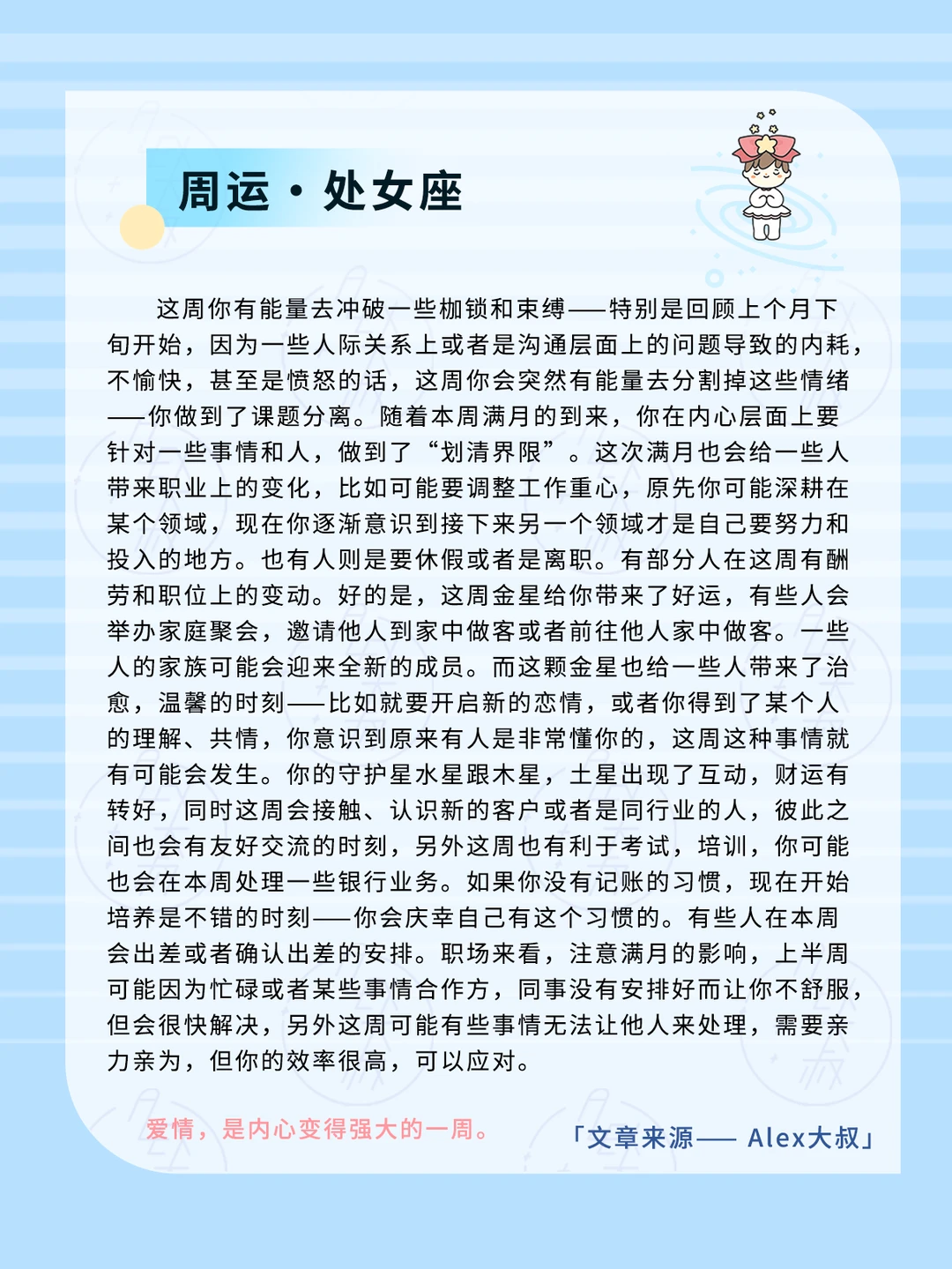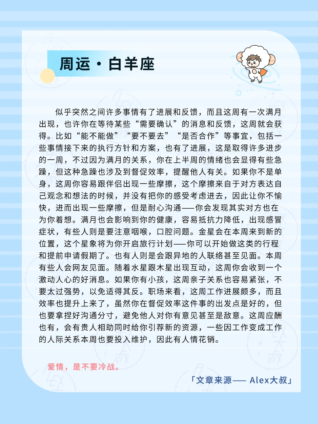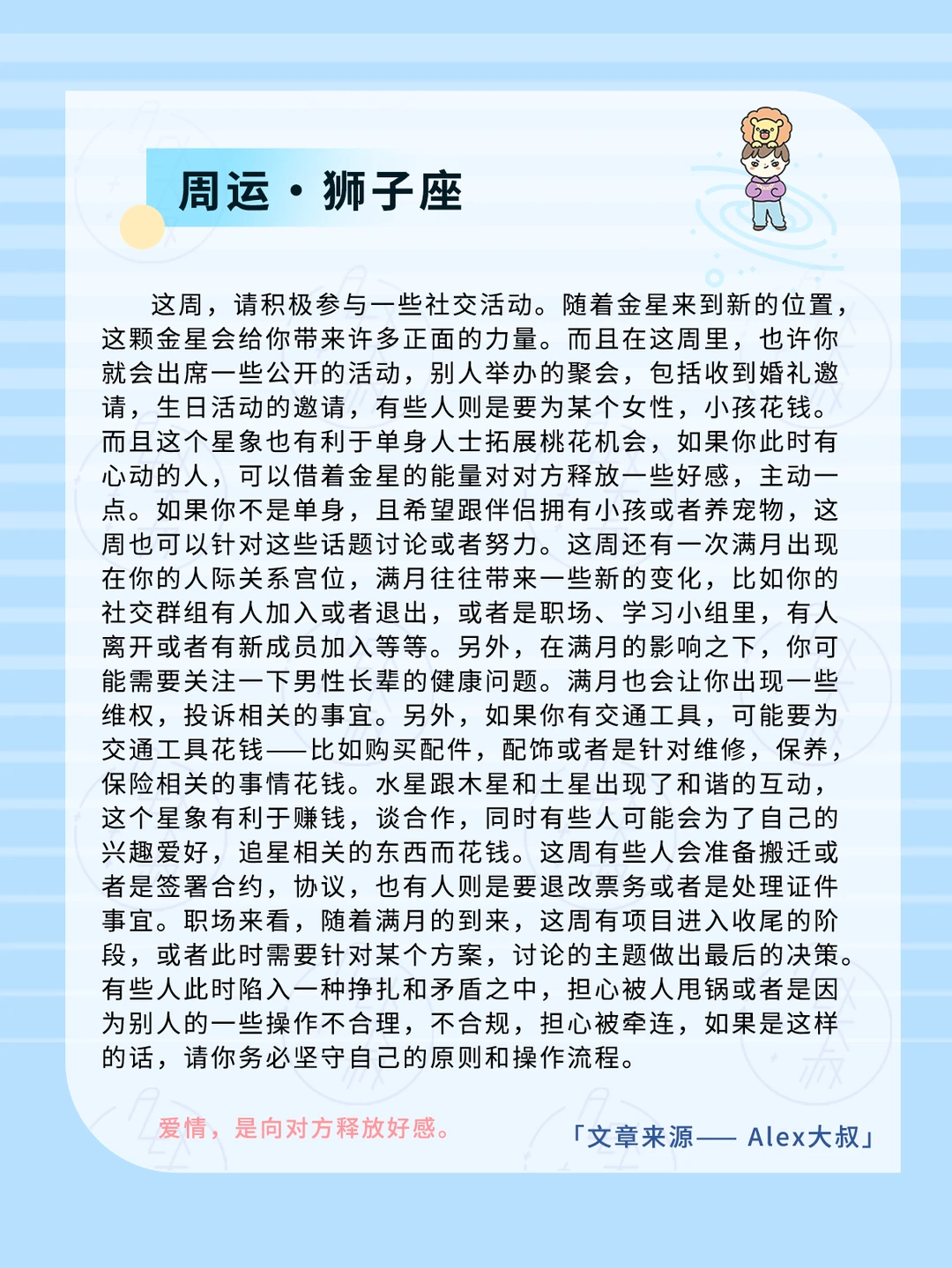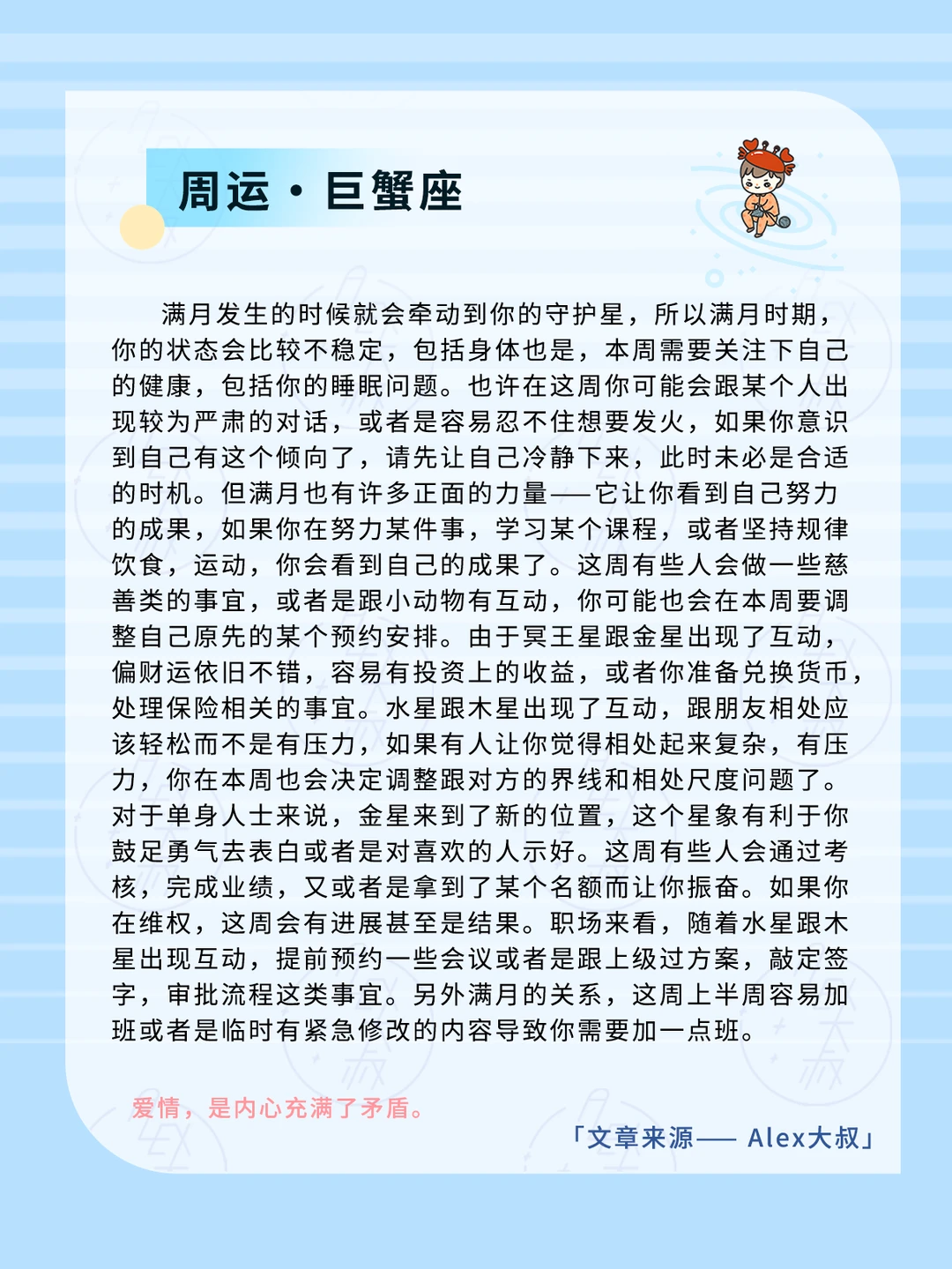满月会引发我们的一些健康问题,比如呼吸道,睡眠,过敏,或者是四肢关节炎症、扭伤,又或者是出现神经痛的情况,这周如果出现这类情况,请及时就医或者是遵医嘱的前提下服用相关的药物。