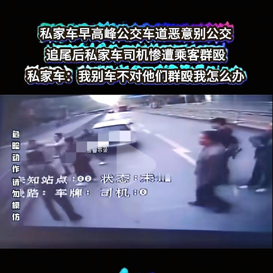 这挨打的值吗? 私家车占公交道恶意别车, 被追尾后司机遭群殴,主要还是大清早,一群赶早高峰的上班族。 私家车司机明知公交道是专用道还故意别车,本身就是交通违法,可公交乘客用群殴来解决问题,也有点儿过激了。 别车的司机缺了交通规则意识,群殴的乘客丢了法律底线,看似是一时火气,实则是把公共道路当成了发泄情绪的地方。 就算对方有错,也该交给交警和法律来判定,用暴力回应暴力,只会让小事变大事。 少点路怒,多点理性,才是避免这类冲突的关键。你觉得遇到别车这种事,除了报警还能怎么合理应对?追尾司机吵架 车停小区被贴条 别车超车 私家车霸占 公交打人 在高速上被别车 女车主互殴 早高峰