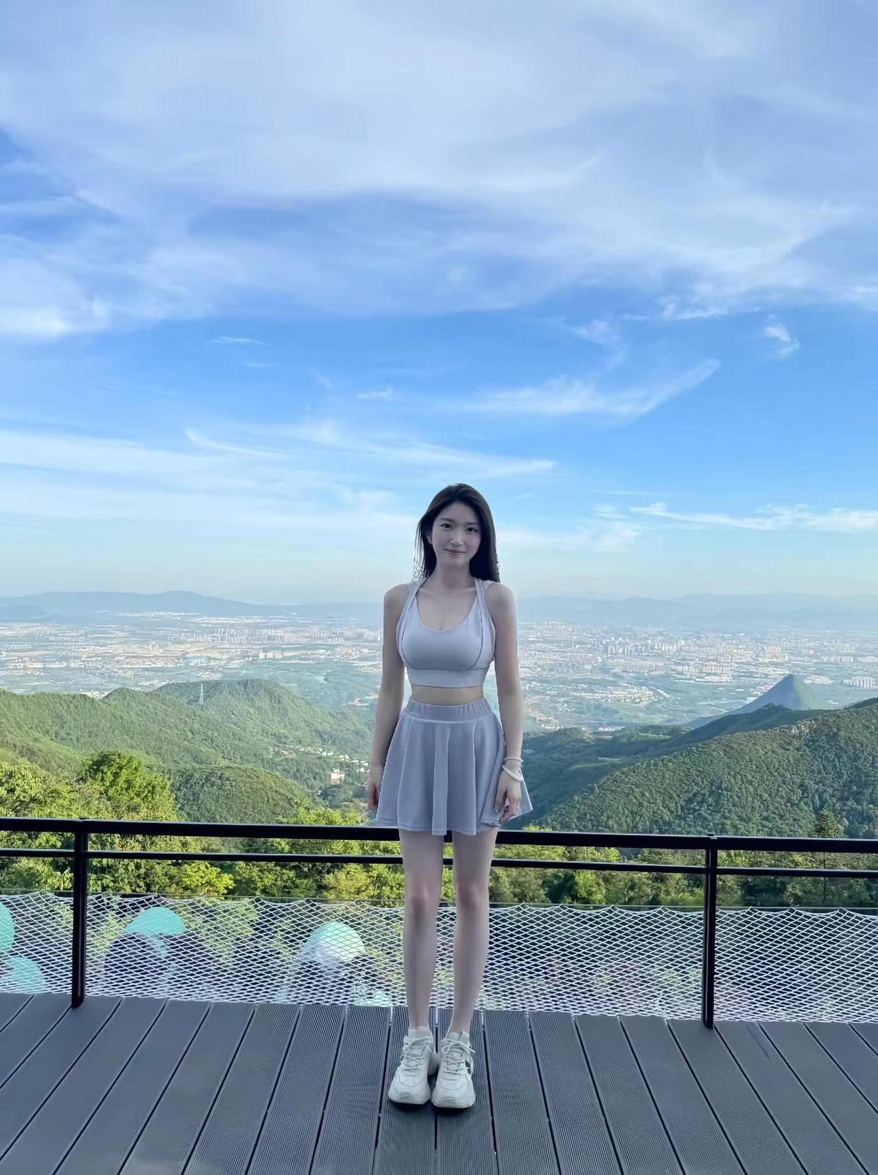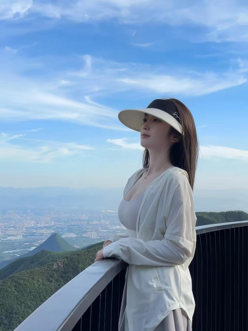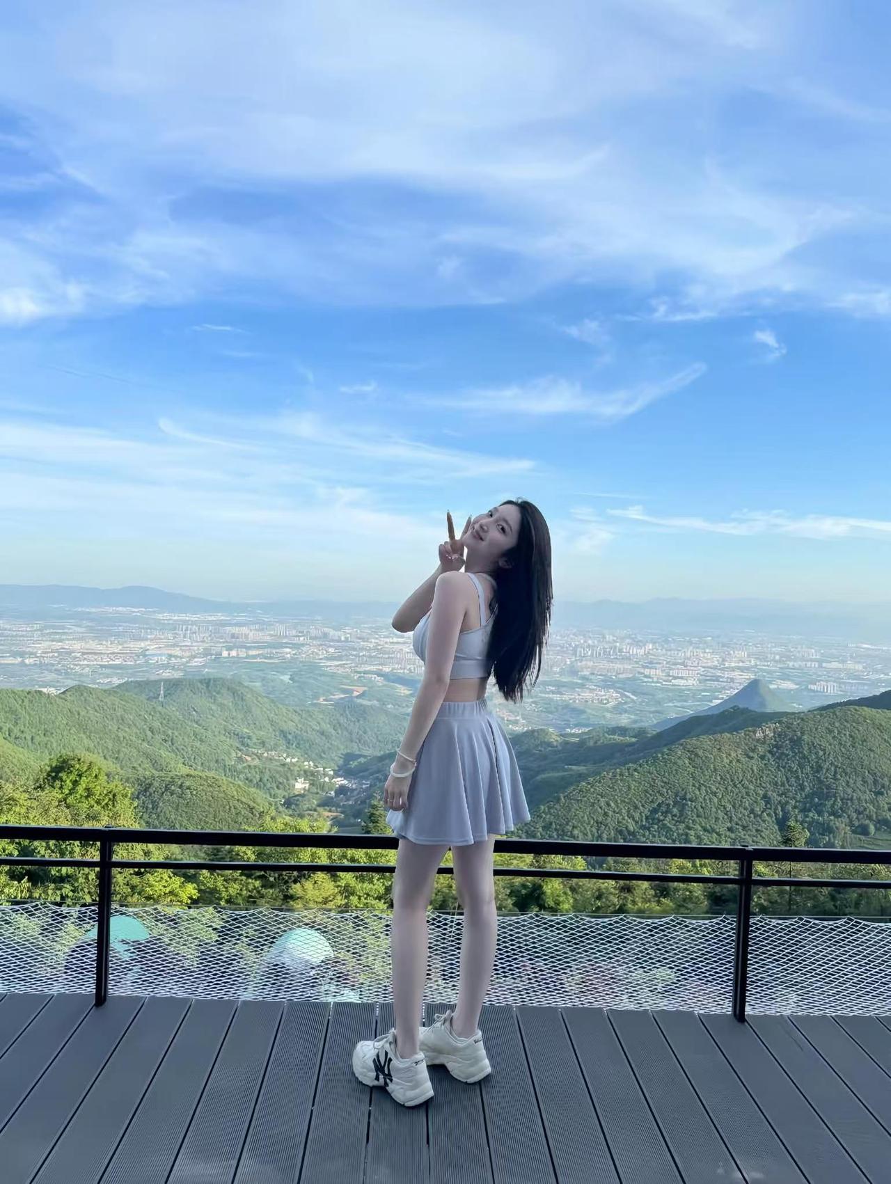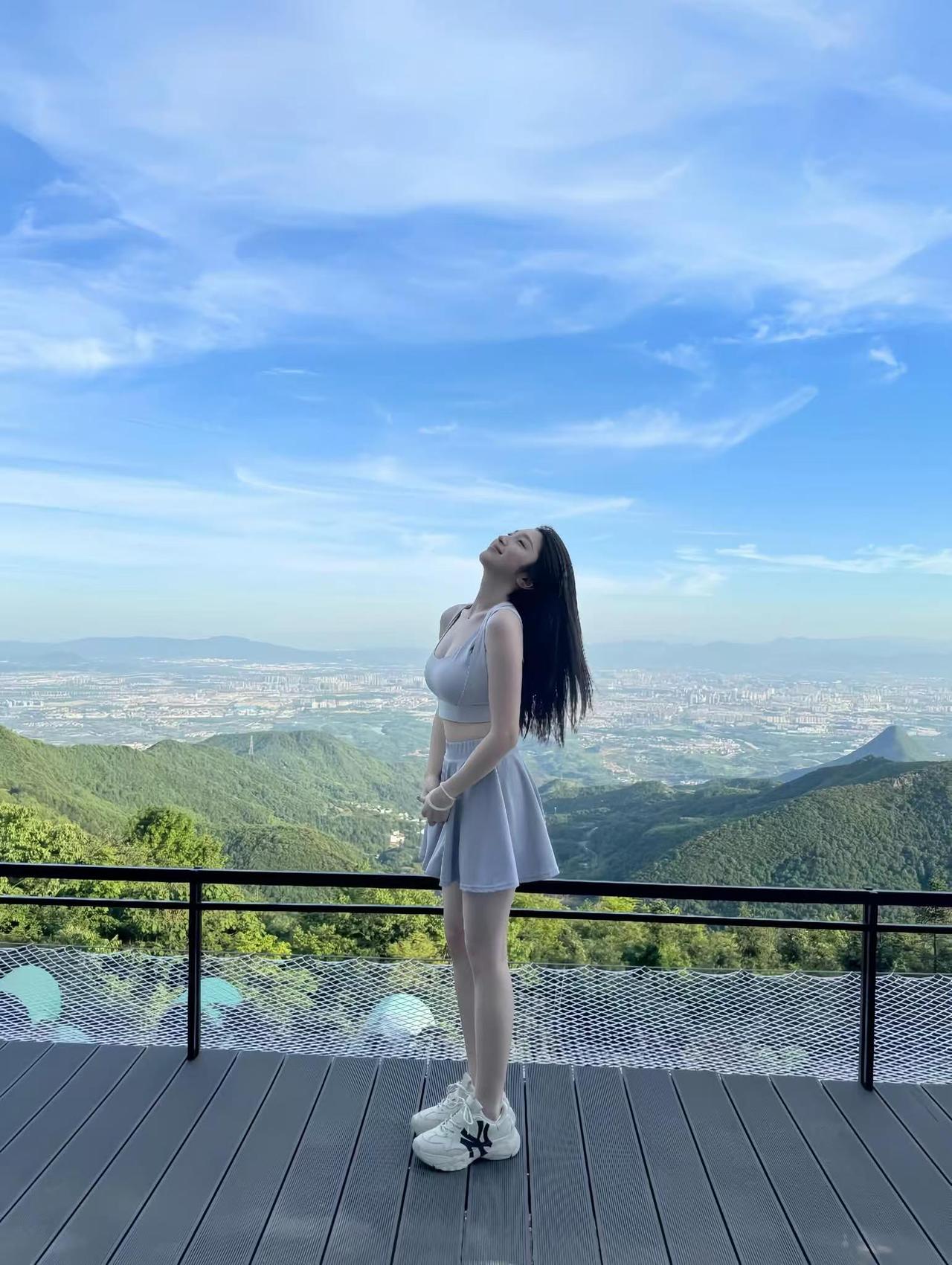 周末起猛了爬个山,本来寻思消耗下昨天的奶茶,结果到顶直接看傻了——这天蓝得跟P的似的,云软乎乎飘着,底下的楼跟我家积木堆似的挤一块儿。穿这身裙装是真选对了,爬的时候不勒腿,站这儿吹风还贼凉快。风裹着树叶味儿往鼻子里钻,比空调房舒服一万倍,下山必须整根五毛的老冰棍,这才是周末该有的样儿!