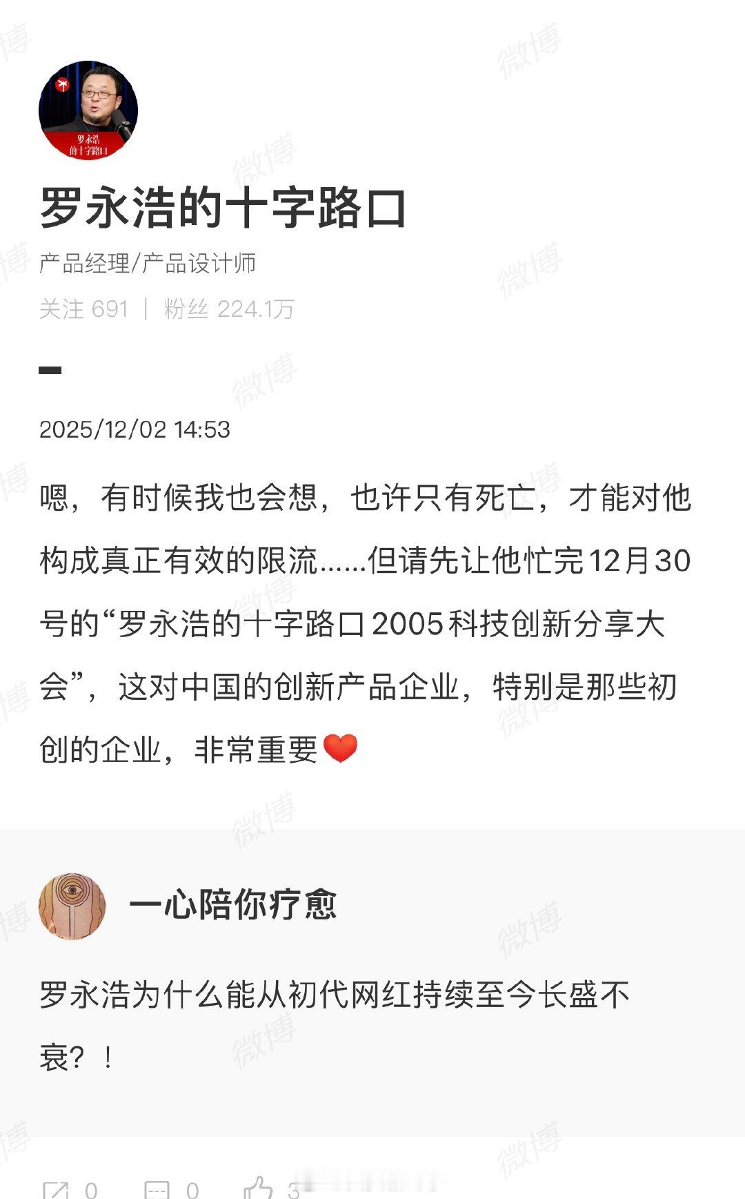 【罗永浩回应为何能长盛不衰】罗永浩回应被指长盛不衰近日,有网友发文询问罗永浩为什么能从初代网红持续至今长盛不衰,12月2日,发文回应此事,称:有时候我也会想,也许只有死亡,才能对他构成真正有效的限流……但请先让他忙完12月30号的“罗永浩的十字路口2005科技创新分享大会”, 这对中国的创新产品企业,特别是那些初创的企业,非常重要。罗永浩谈三星三折叠