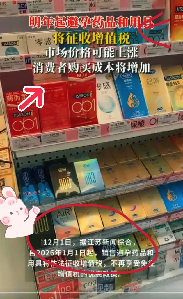 避孕要多花钱了!2026年起避孕药品和用具要征13%增值税,延续32年的免税福利没了,以后买这些东西真得精打细算。 别光吐槽涨价,这背后其实是人口政策的大转向。过去免税是为了配合计划生育,现在出生率持续走低,政策重心早就偏向鼓励生育了。一盒避孕药涨几块钱,比起养孩子的巨额开销确实不算多,但对低收入群体来说,也是实打实的生活成本增加。 不过说会像有些国家那样禁止堕胎就想多了,我国法律明确保障合理的终止妊娠权利,这和尊重生命并不冲突。鼓励生育的核心,不该是提高避孕成本,而该是减轻育儿负担。 政策调整是信号,但真正让人愿意生孩子,还得靠实打实的福利支持。你觉得避孕用品涨价,真能改变大家的生育选择吗?避孕 避孕方式 避孕险 避孕用品征税