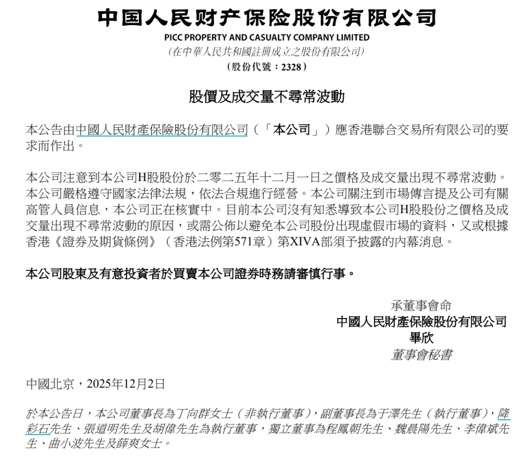 12月2日晚间,人保财险在港交所发布公告称,其注意到公司H股股份于2025年12月1日的价格及成交量出现不寻常波动。